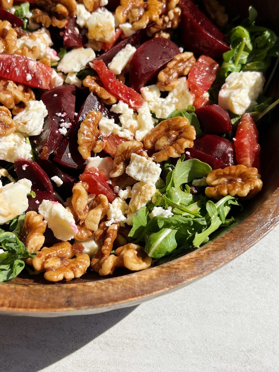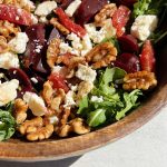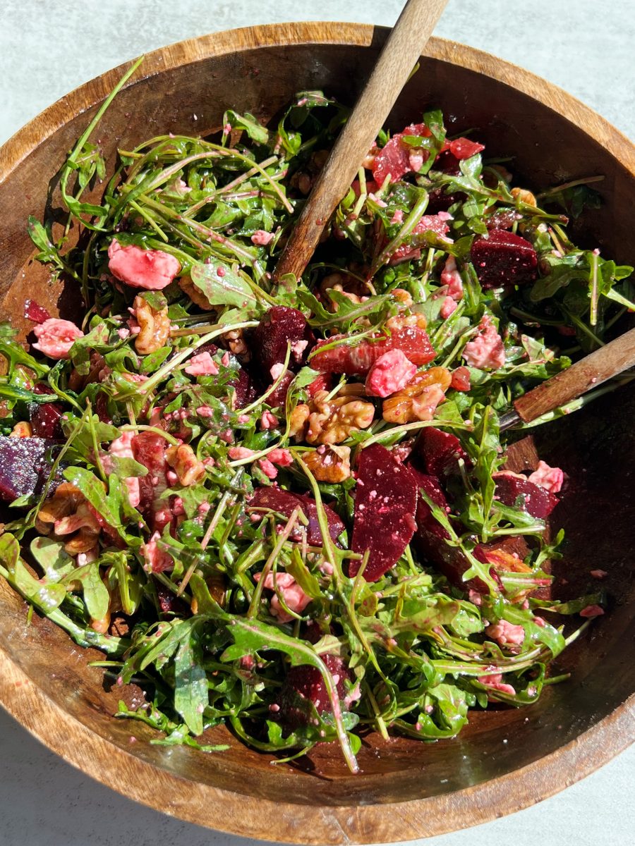 The warmer temperature definitely has me craving more fresh salads. This delicious arugula beet salad is tossed with chopped beets, feta cheese, and 5 minute candied walnuts!