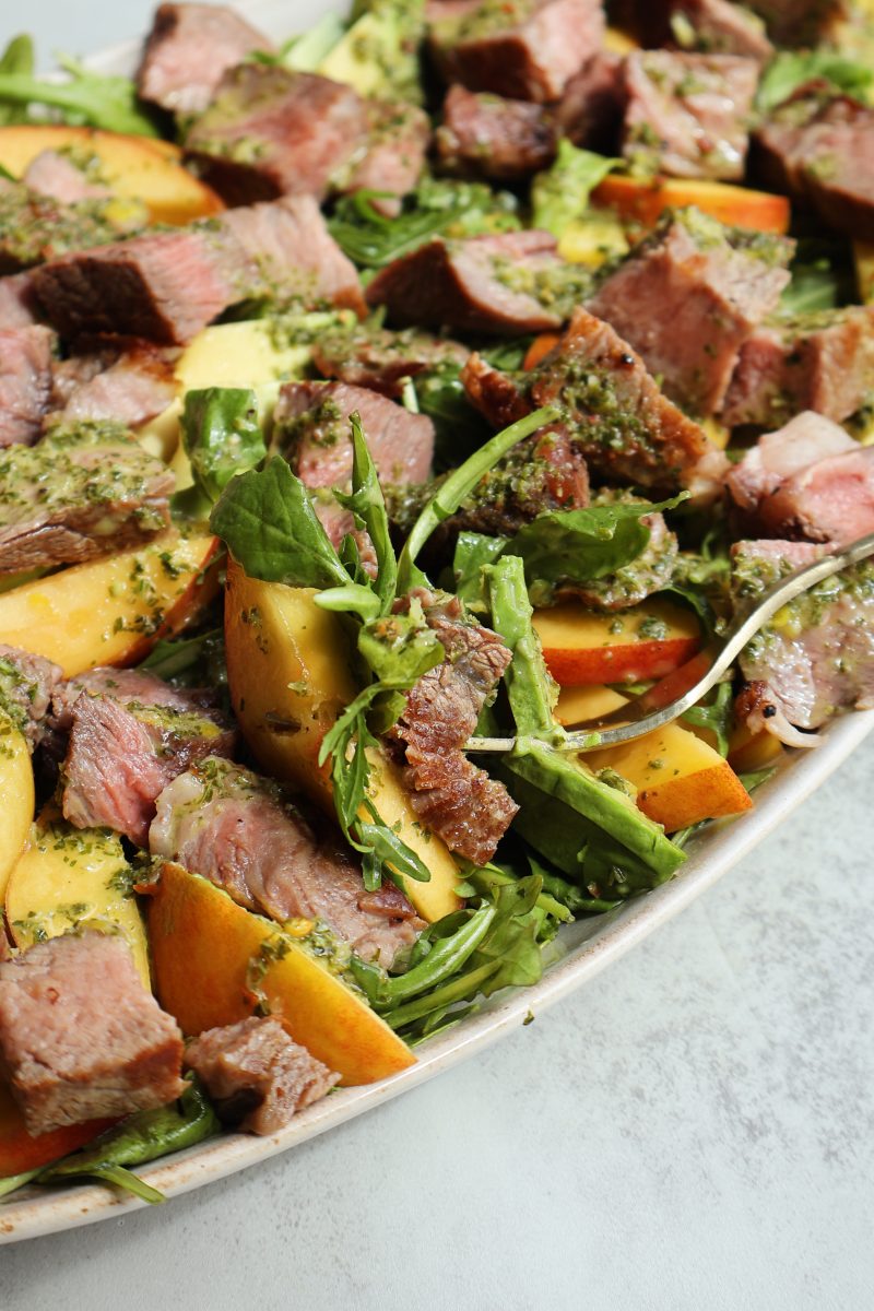 This arugula steak salad with peaches and mint vinaigrette has all of the best flavors in one bite. It’s light and fresh, and the perfect salad for a crowd! I can’t wait for you guys to try it.