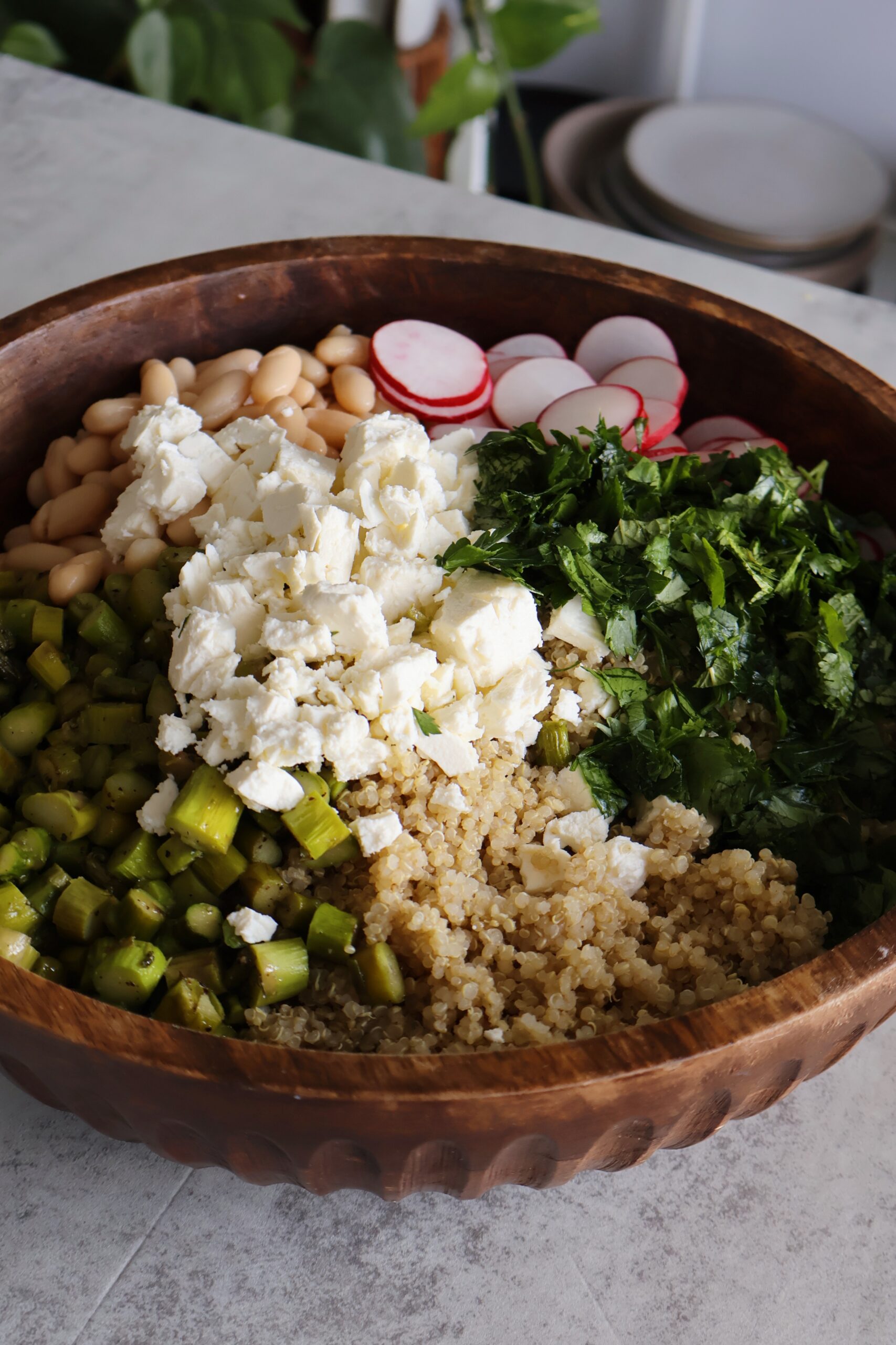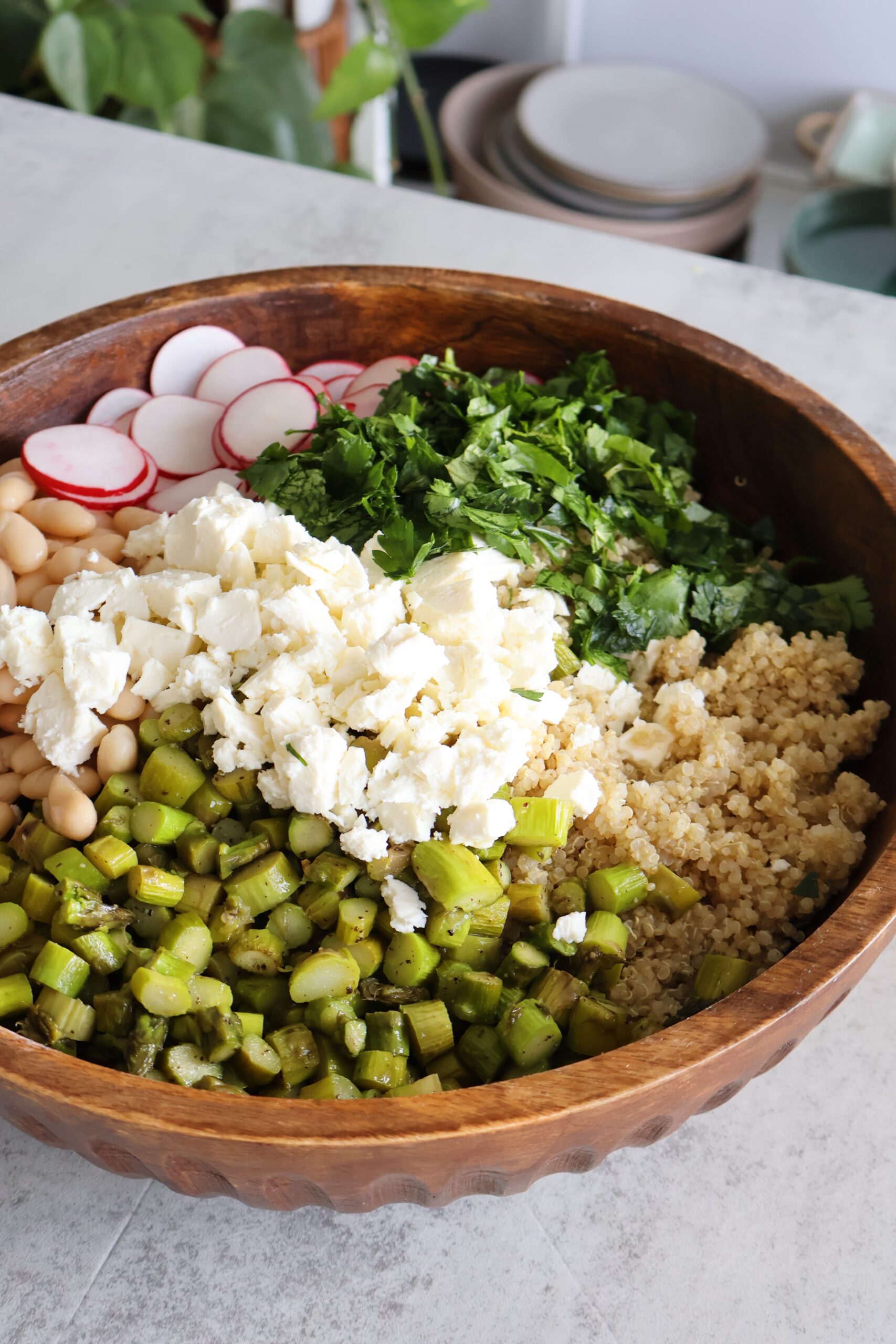 - Add the fluffed quinoa to a large salad bowl with the sauteed asparagus, beans, sliced radishes, feta cheese and chopped herbs. Toss together with the lemon dressing. Taste and adjust salt & pepper if needed.