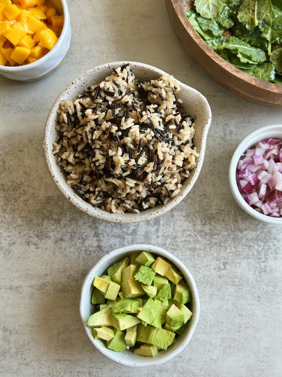 Avocado & mango wild rice salad is a nourishing side dish loaded with all the delicious flavors! Made with wild rice, crunchy nuts, sweet mango and savory feta cheese with a simple citrus vinaigrette.