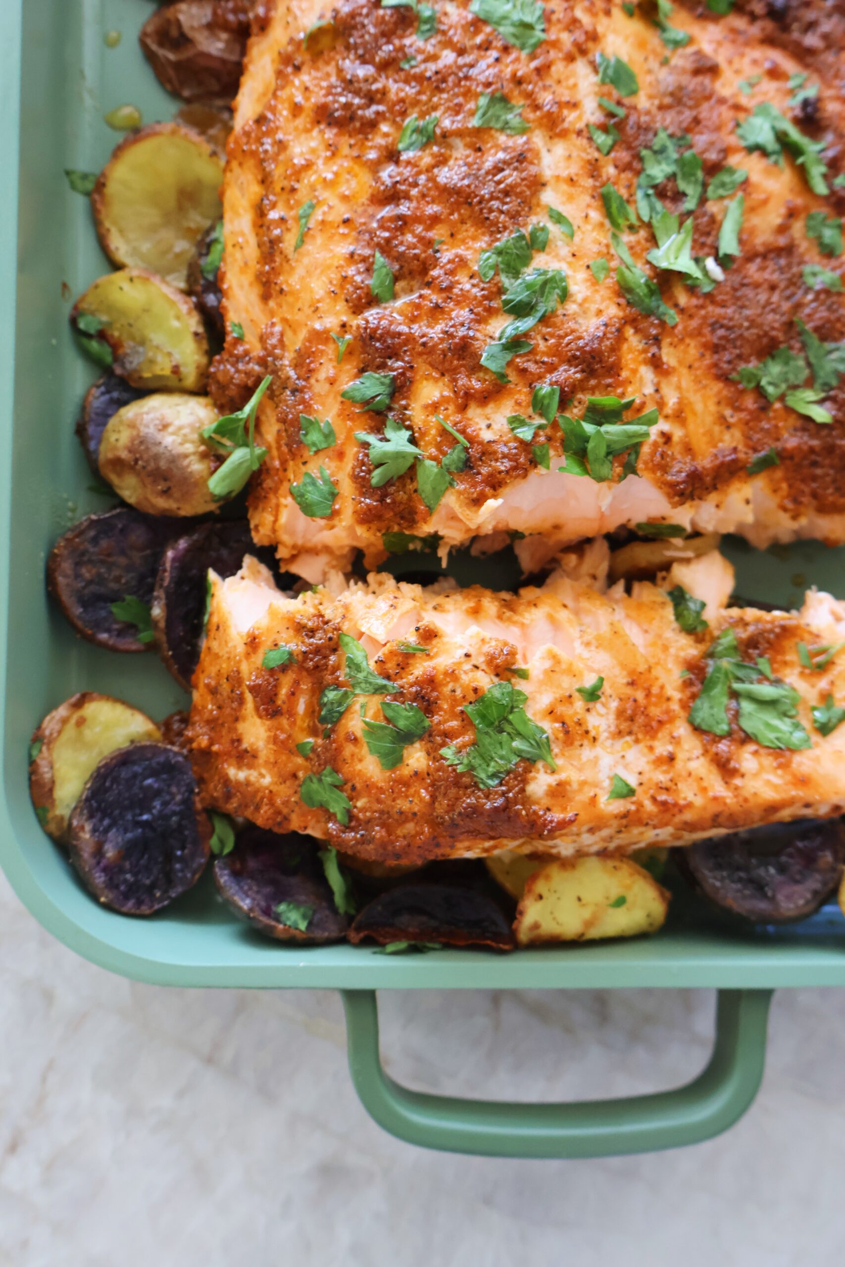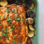 The sheet-pan baked salmon and potatoes is one I could eat on repeat for dinner. With minimal clean up and maximum flavor, it’s a well-rounded dinner that the whole family will love.