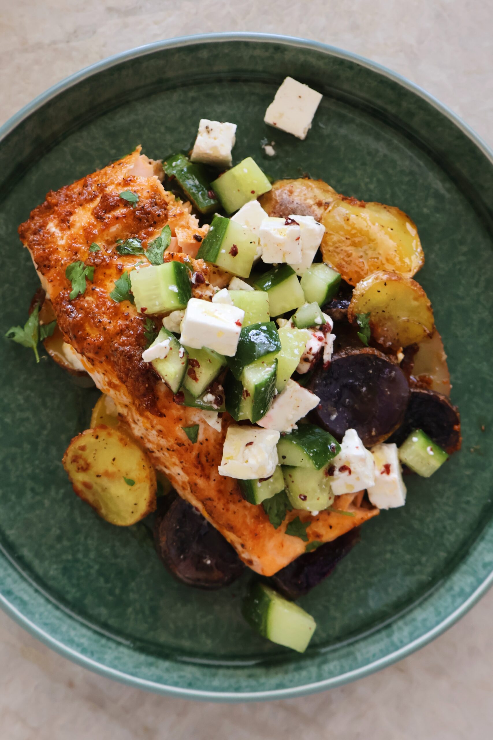 Baby potatoes are slices and roasted with salt, pepper and garlic powder, then topped with a salmon fillet thats marinated in dijon mustard, olive oil and some spices. The potatoes are crisp, the salmon comes out flakey, and everything gets served with a fresh cucumber feta salad.