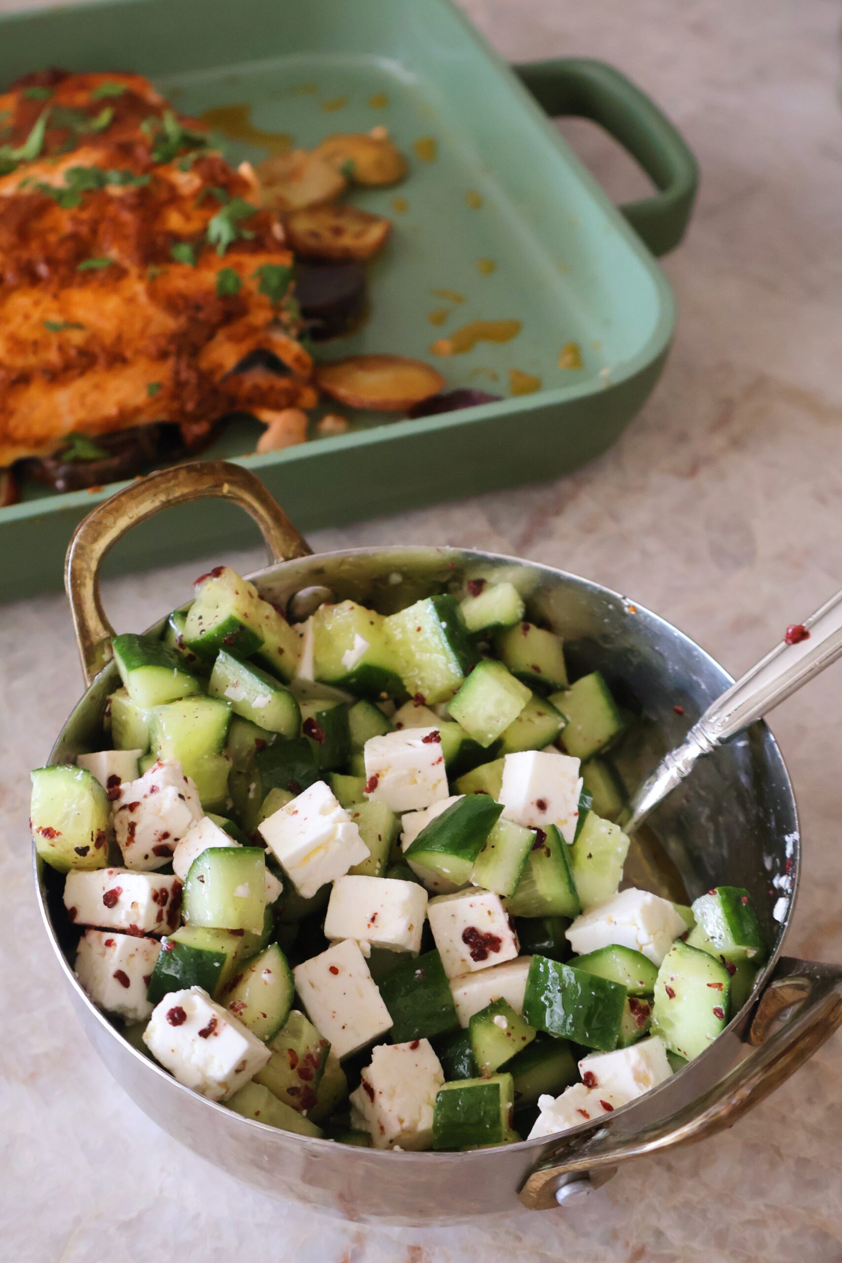- Prepare the cucumber feta salad by dicing the cucumbers and feta and mixing them with the olive oil, lemon juice, sumac and salt & pepper.