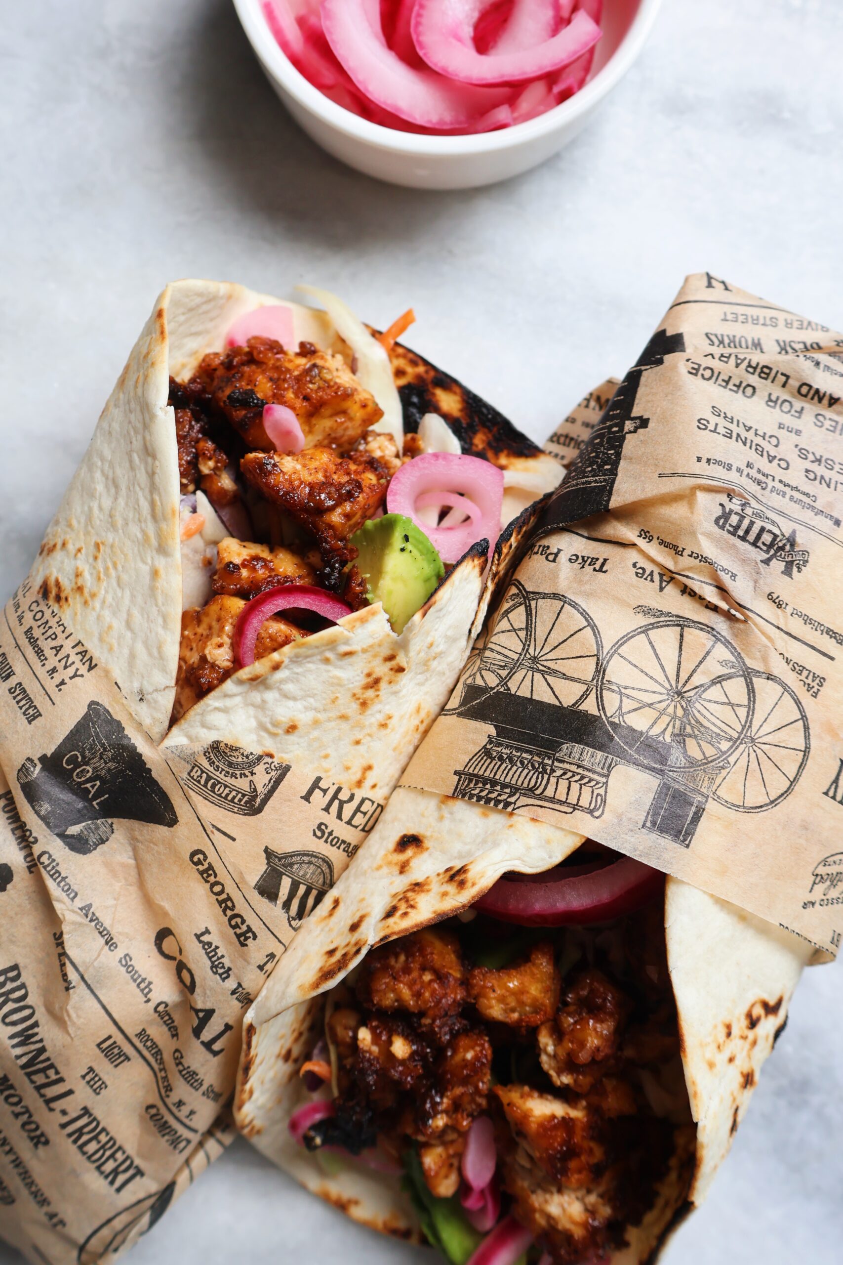 This recipe can easily double as meal prep if made ahead of the week. The tofu, pickled onions and cabbage slaw will stay fresh in the fridge for a few days, so you can assemble the wraps when ready to serve, or enjoy this recipe as a bowl over rice or your favorite grain.