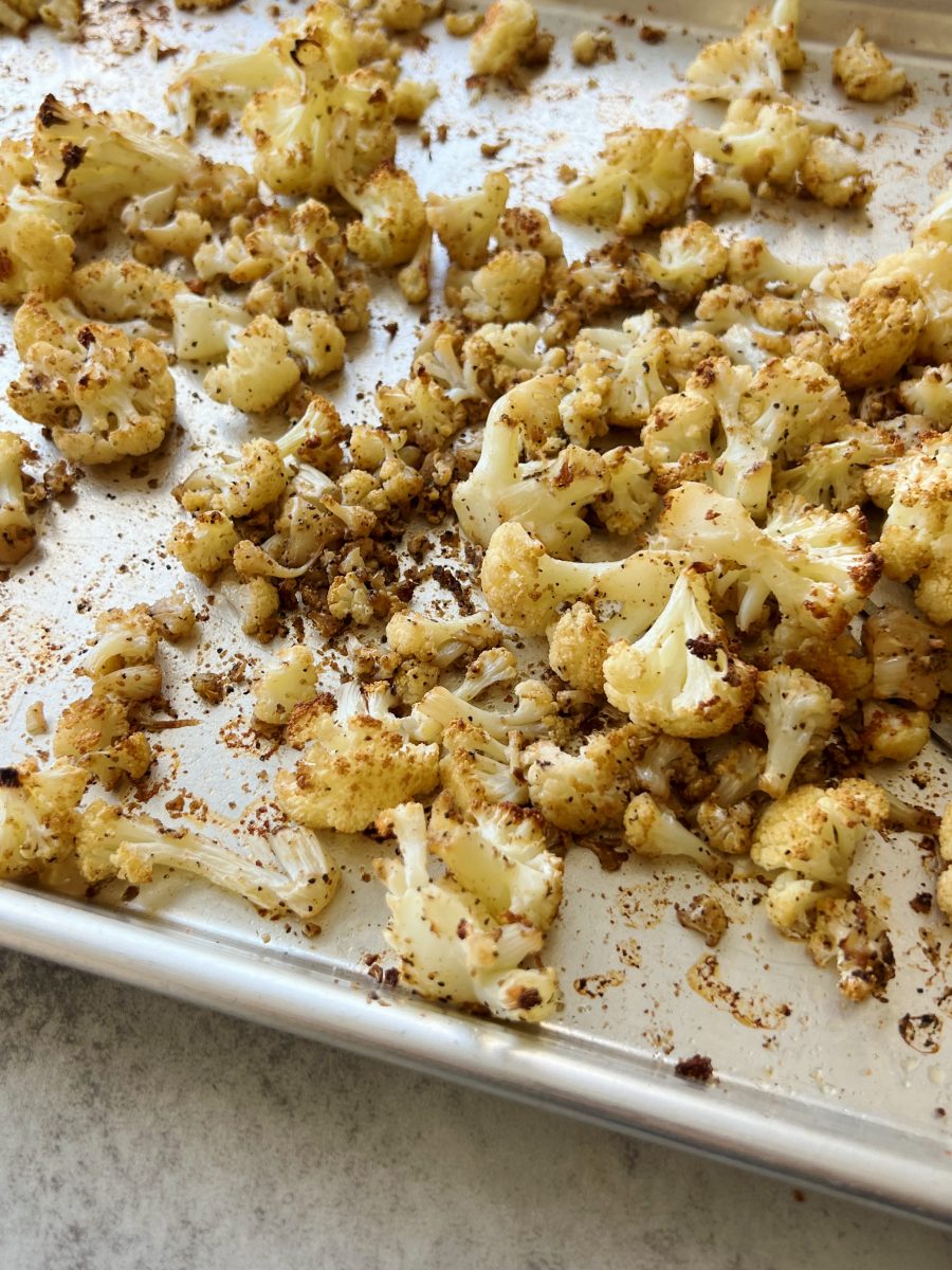 - Trim the stem off of the cauliflower and cut into florets. Add the cauliflower to a sheet pan and drizzle generously with olive oil and toss with the salt, pepper, garlic powder and cayenne pepper.