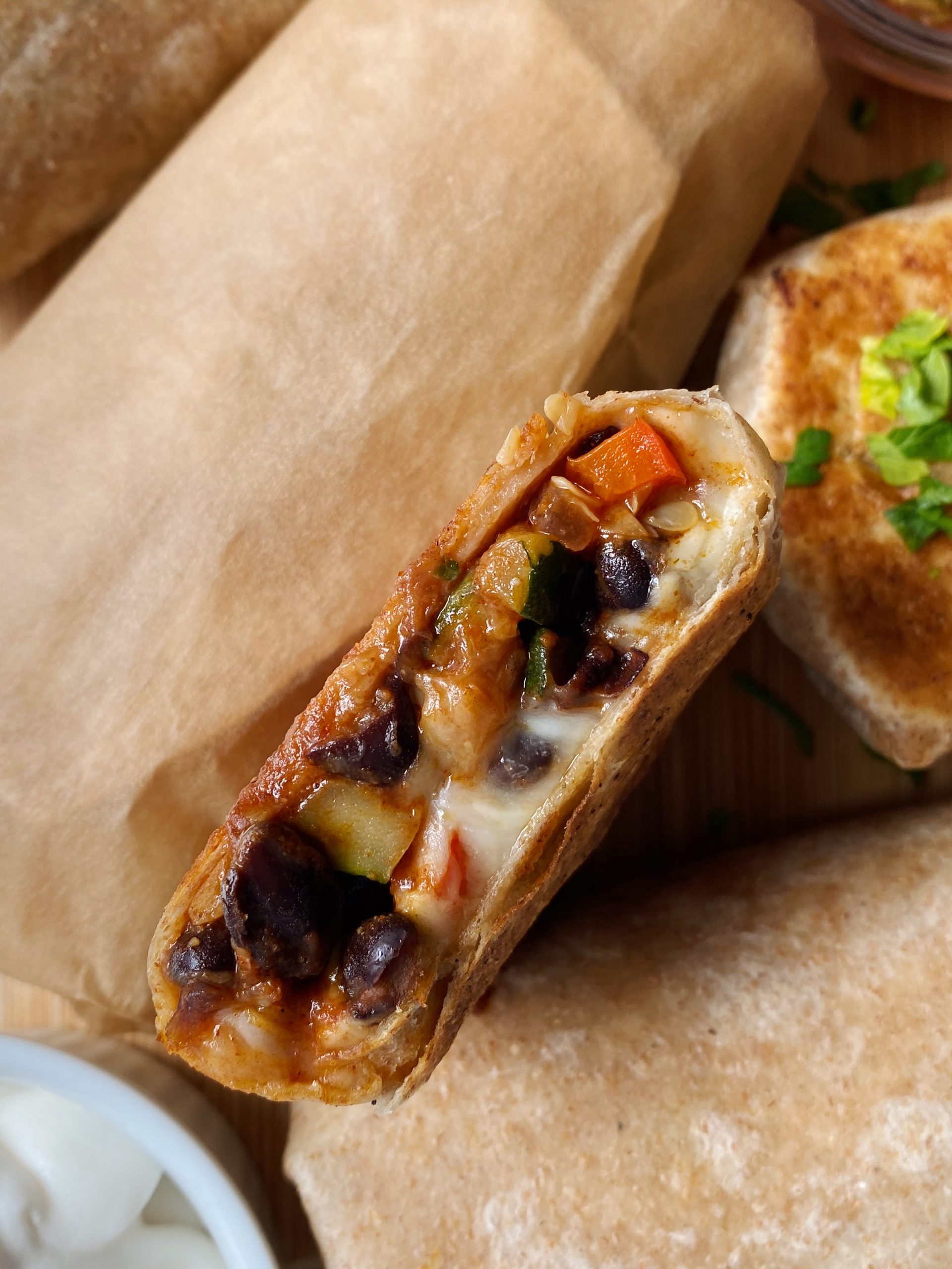 Wrap each burrito individually in parchment paper or tin foil, and place them in a reusable storage bag. You want to be sure to place them at the top of the freezer or in the door, so that they don’t get smashed inside in the freezer. You can also store these in a freezer-safe container.