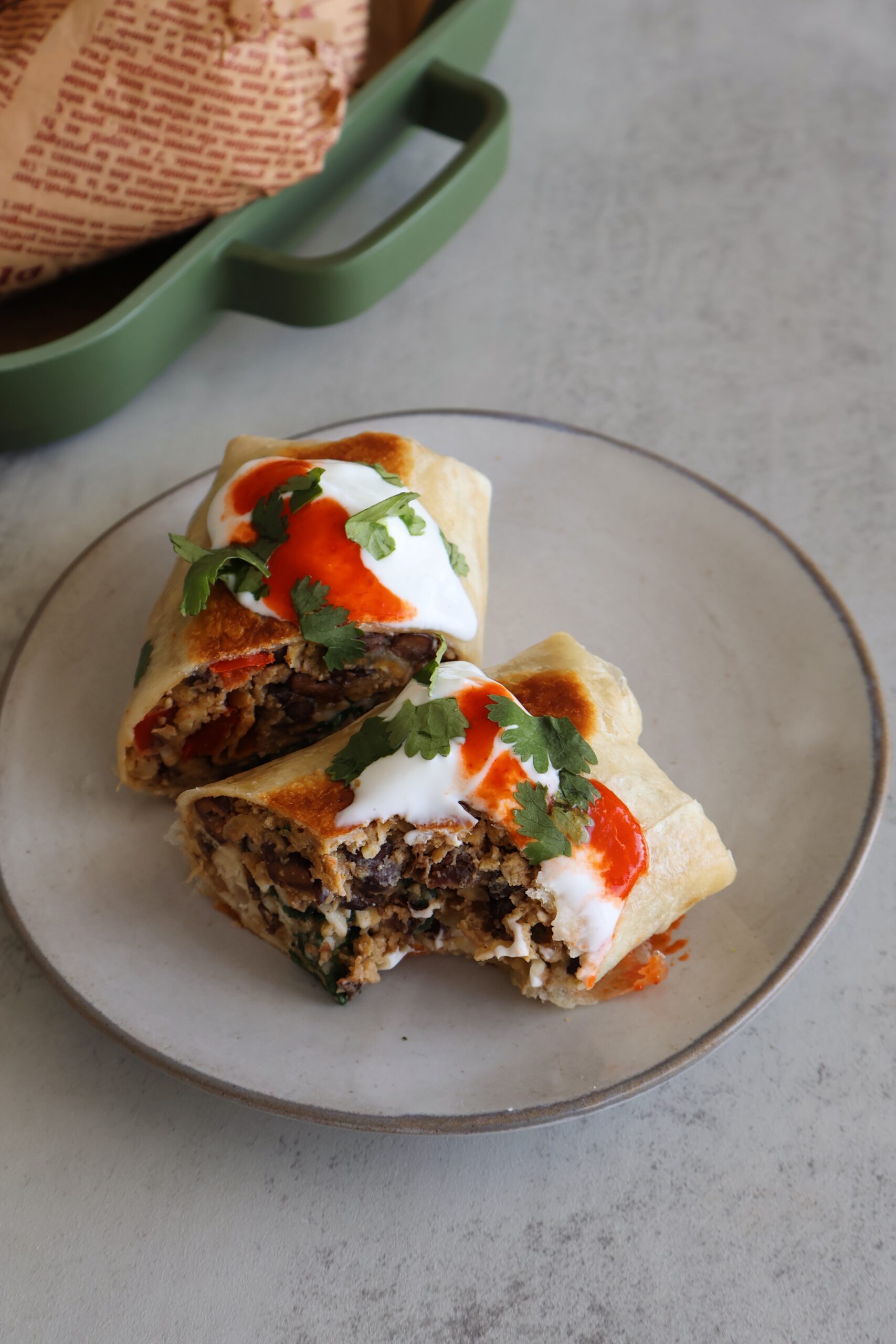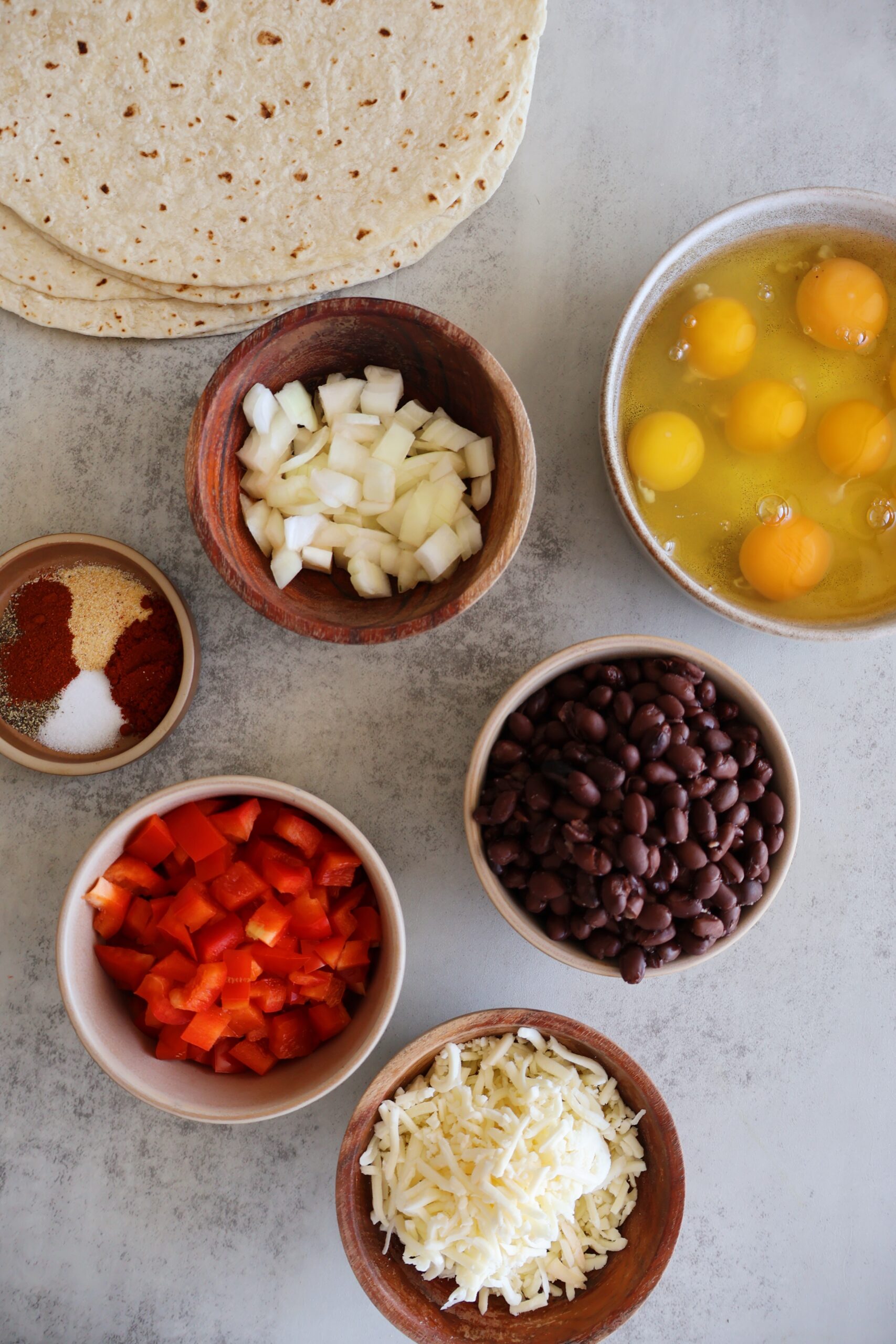 This recipe is so customizable, with countless variations of vegetables, cheese and protein that can be added. These are made with a mix of bell peppers, onions, black beans and eggs scrambled together with a simple spice blend, then assembled in tortillas with shredded mozzarella cheese.
