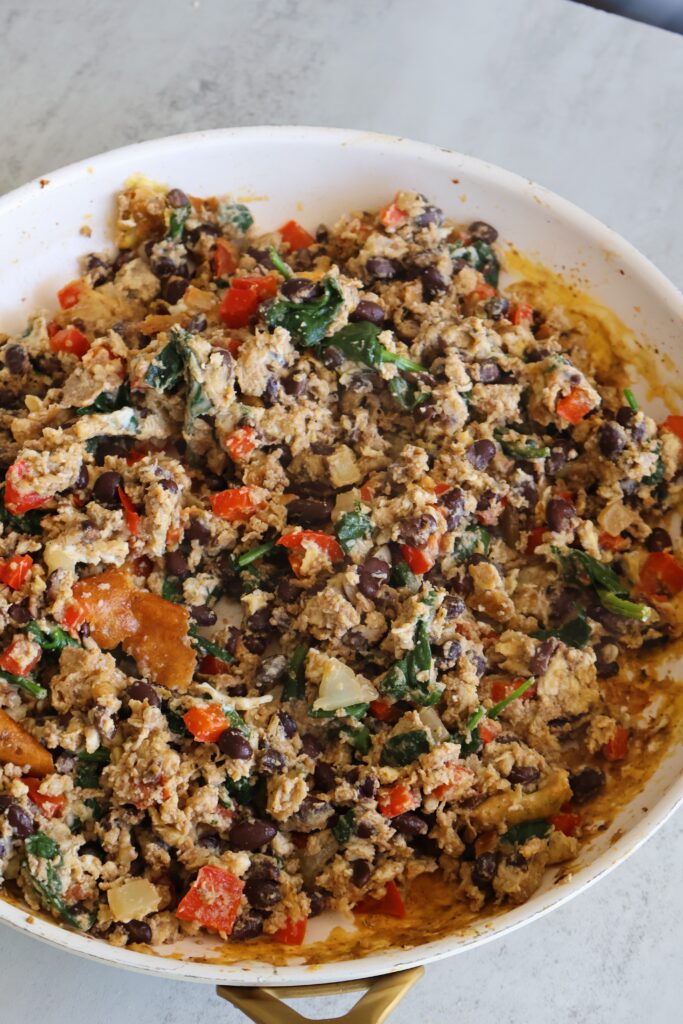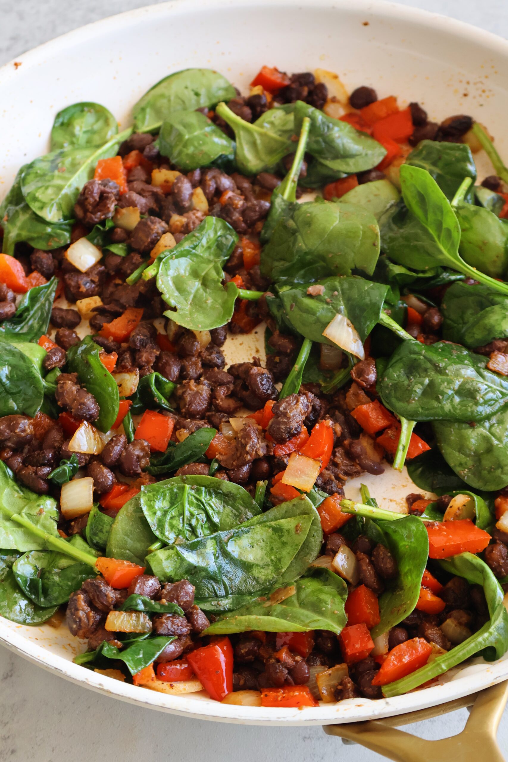 - Add in the drained black beans, spices and spinach and mix for another 2 minutes, until the spinach has wilted.