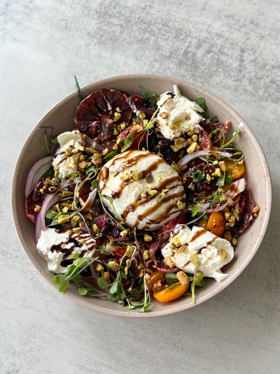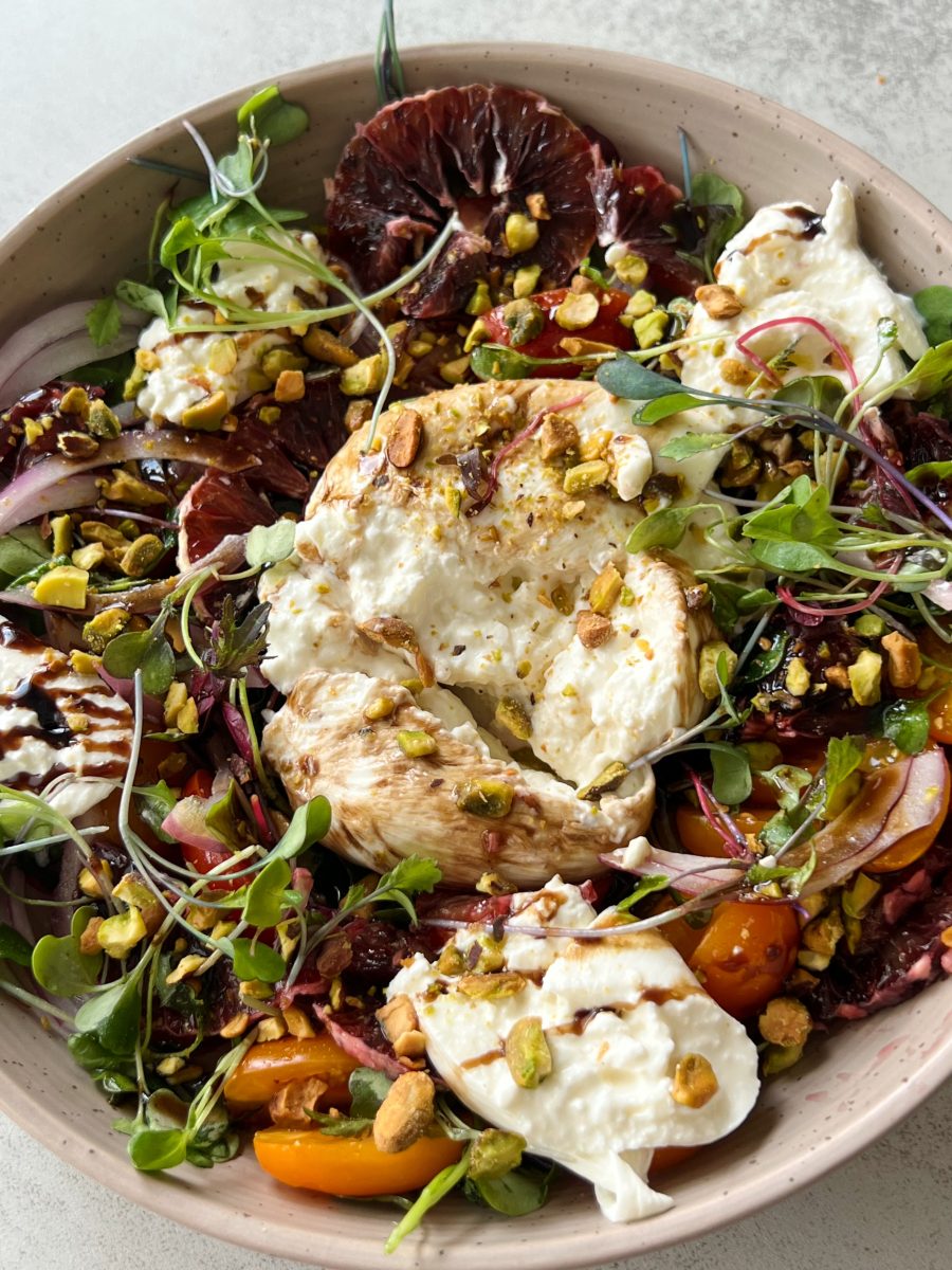 This fresh blood orange burrata salad is made with just a few simple ingredients and is a delicious appetizer to serve all summer long. It’s packed with rich flavor and nutrients, and made with microgreens, burrata, roasted pistachios, and blood oranges.