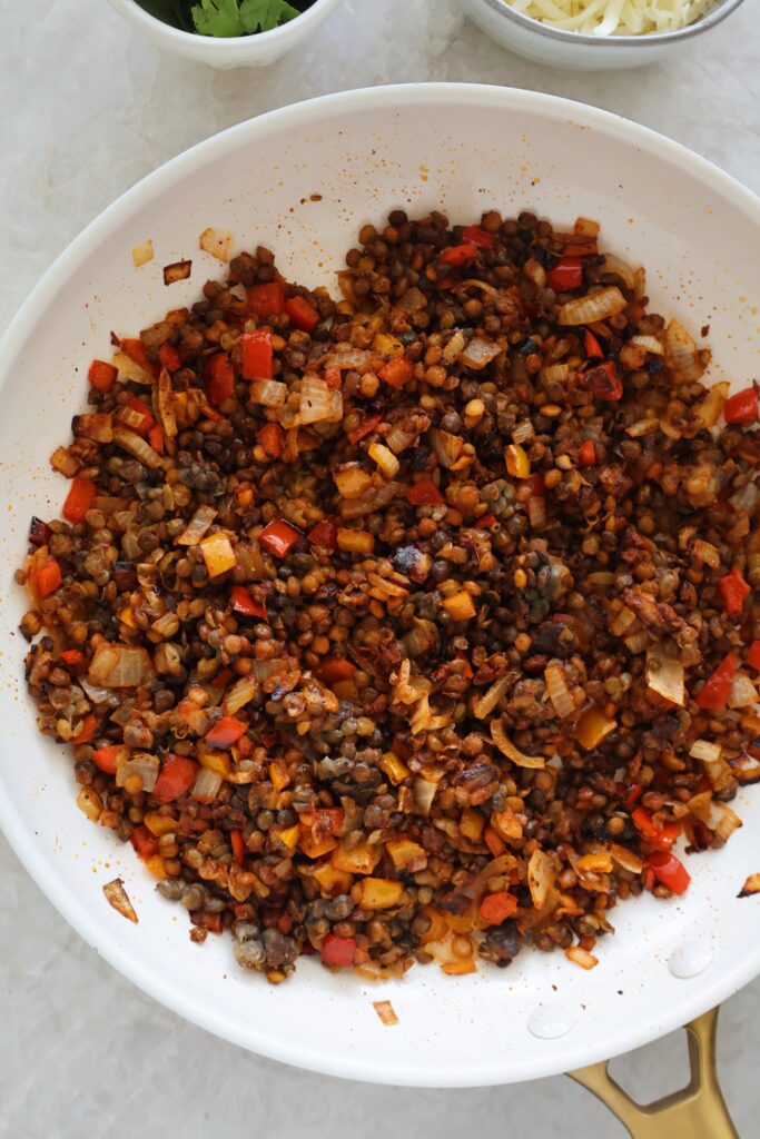 The lentils are cooked with sauteed peppers, onions and spices, stuffed into mini tortillas with shredded cheese, then baked until crisp. I love to top them with fresh cilantro, greek yogurt and jalapenos for even more flavor.