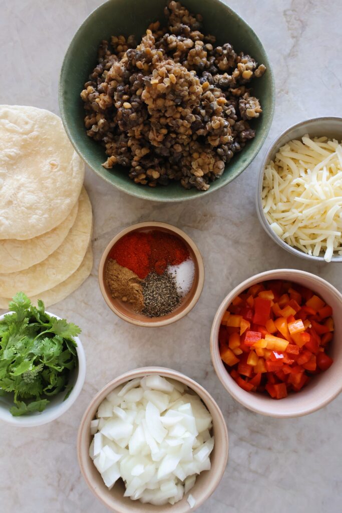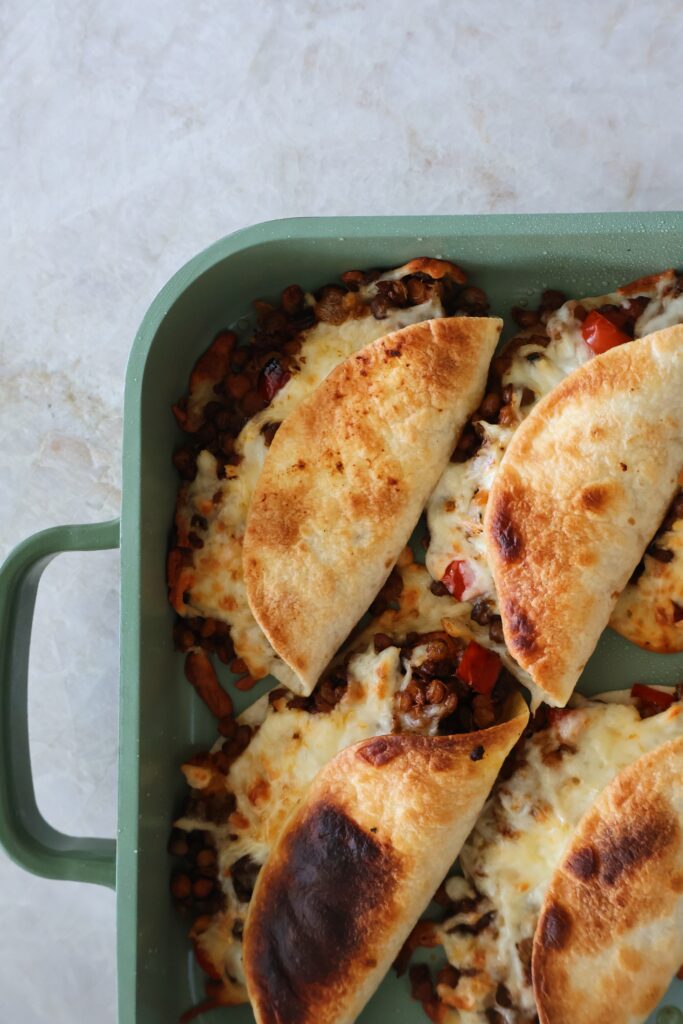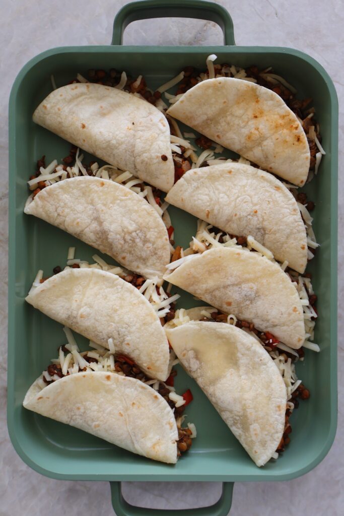 - Layer your mini tortillas with some of the lentil mixture topped with shredded cheese, then fold them over. Place them onto a large baking sheet. Repeat with remaining filling.