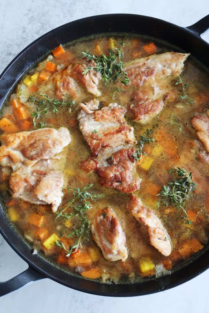 - Place the chicken back into the pan and cover with a lid. Bring everything to a boil, then reduce the flame to simmer for 25-35 minutes