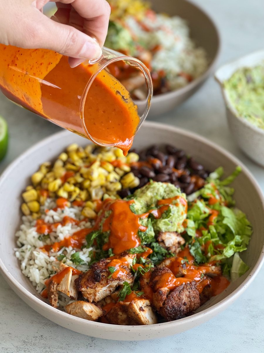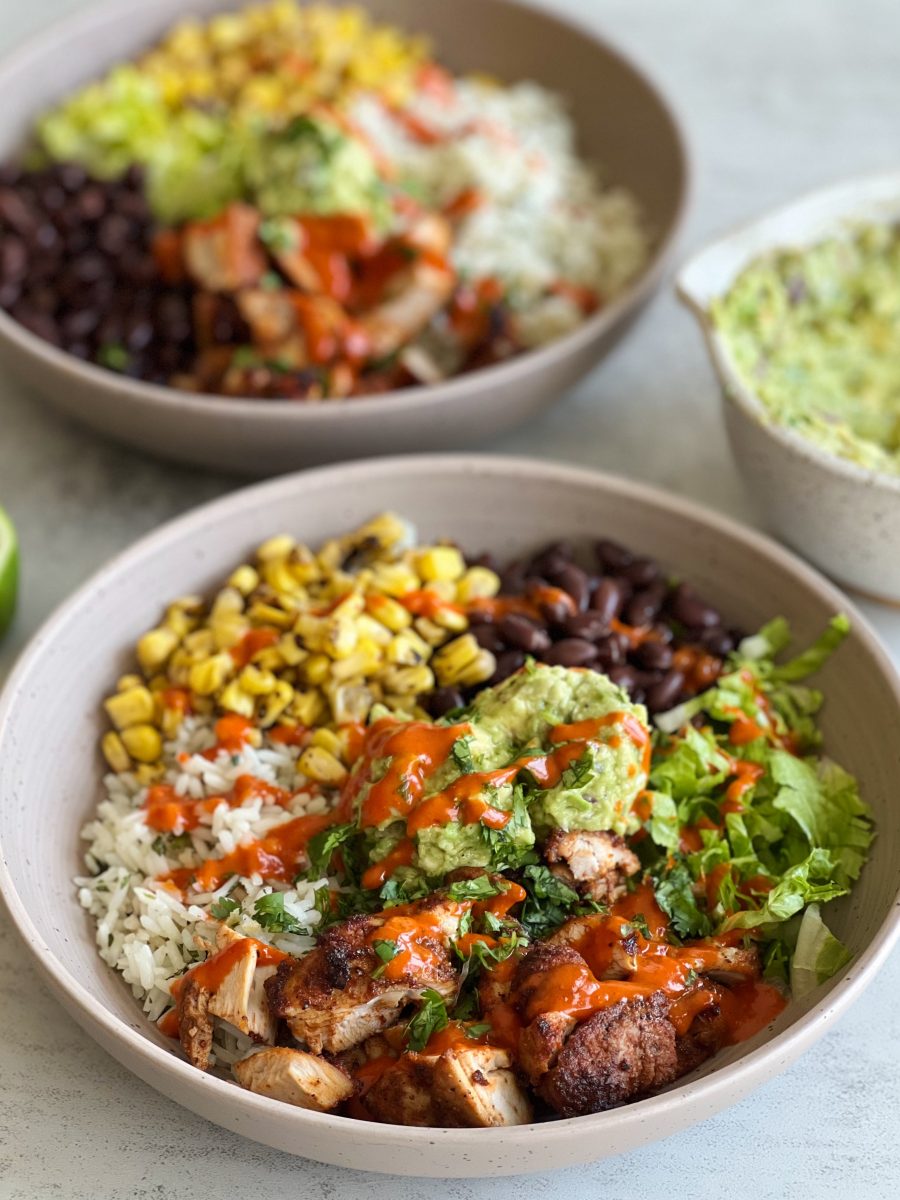 These chicken burrito bowls are full of flavor and such a hearty dinner or lunch to prep for the week. They’re super versatile, and can be made with any toppings of your choice. I can’t wait for you guys to try them!