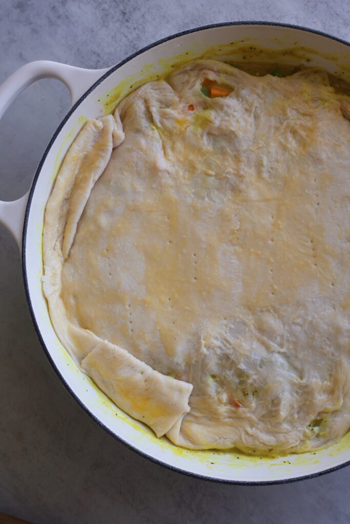 - Roll out your sheet of puff pastry so that its thin enough to cover the pan. Cover the filling with the puff pastry, and poke a few holes throughout using a fork.