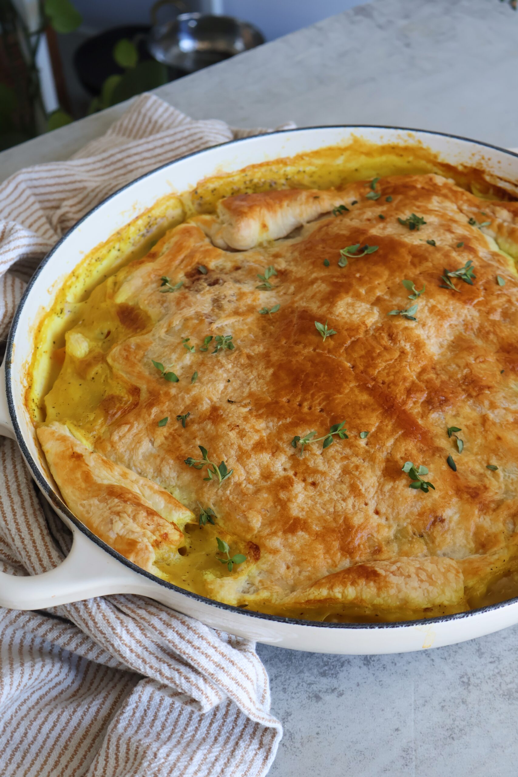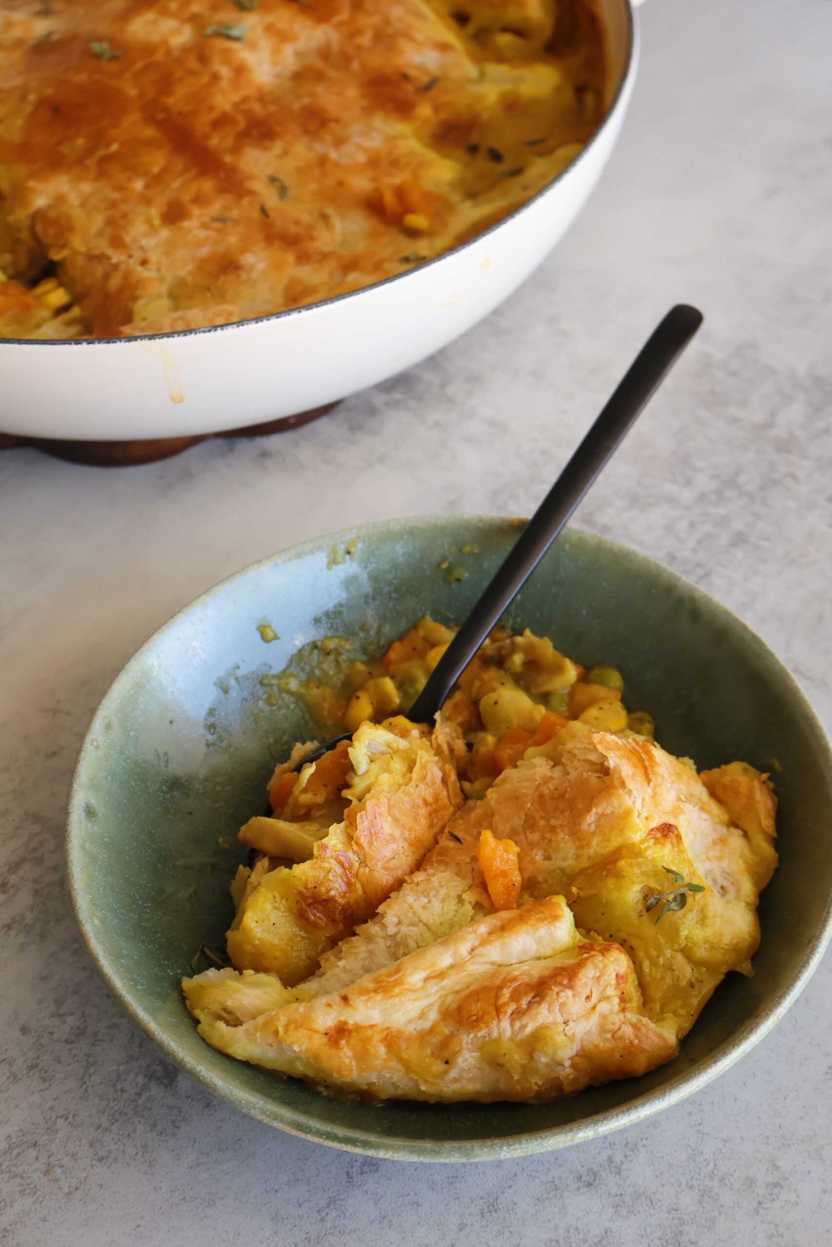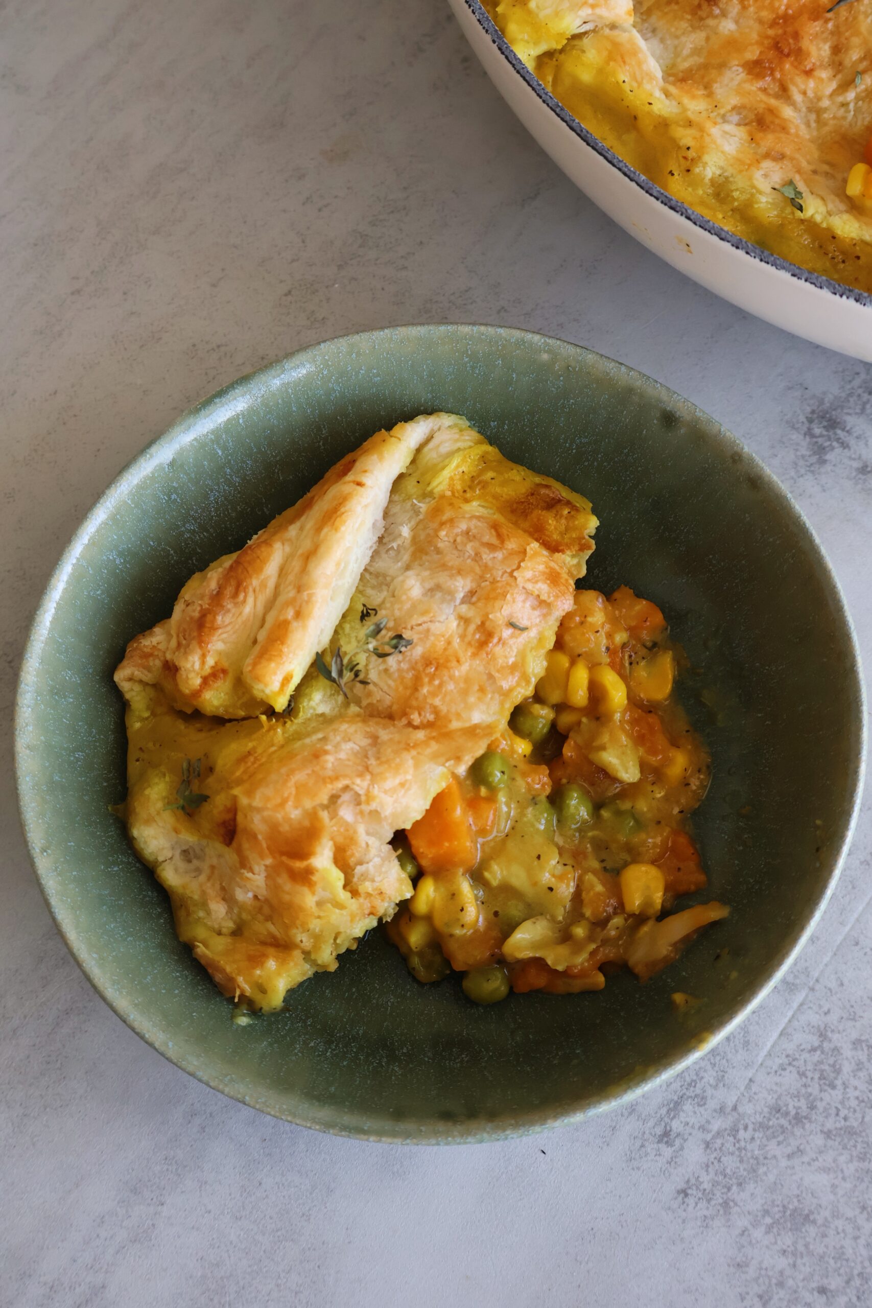 Traditionally, pot pie is made with a layer of pie crust as a topping, but I love this puff pastry variation. It’s an all-in-one dish to serve for weeknight dinner, and a delicious way to serve more veggies this holiday season.