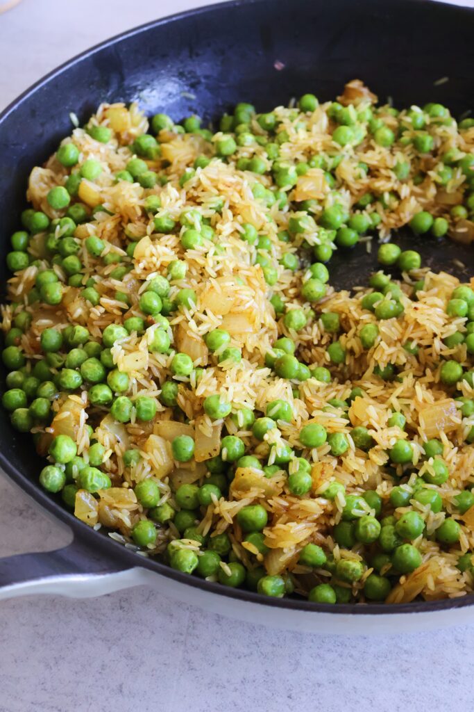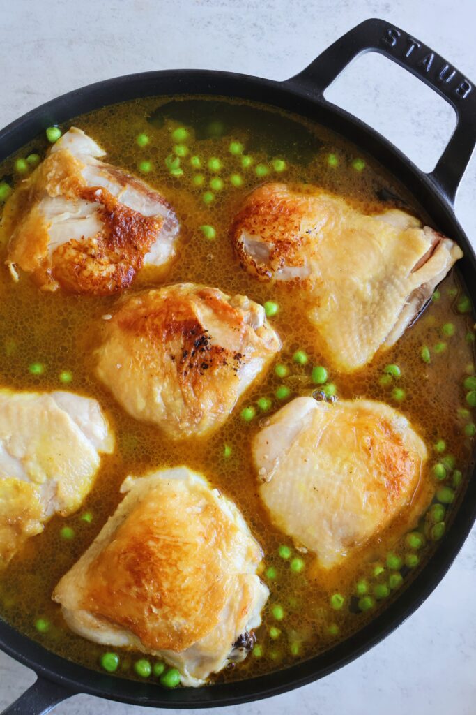 The chicken thighs come out tender, and the peas add the perfect hearty touch with. I serve this with a drizzle of turmeric tahini for a little added flavor, and it’s a dish the whole family loves.