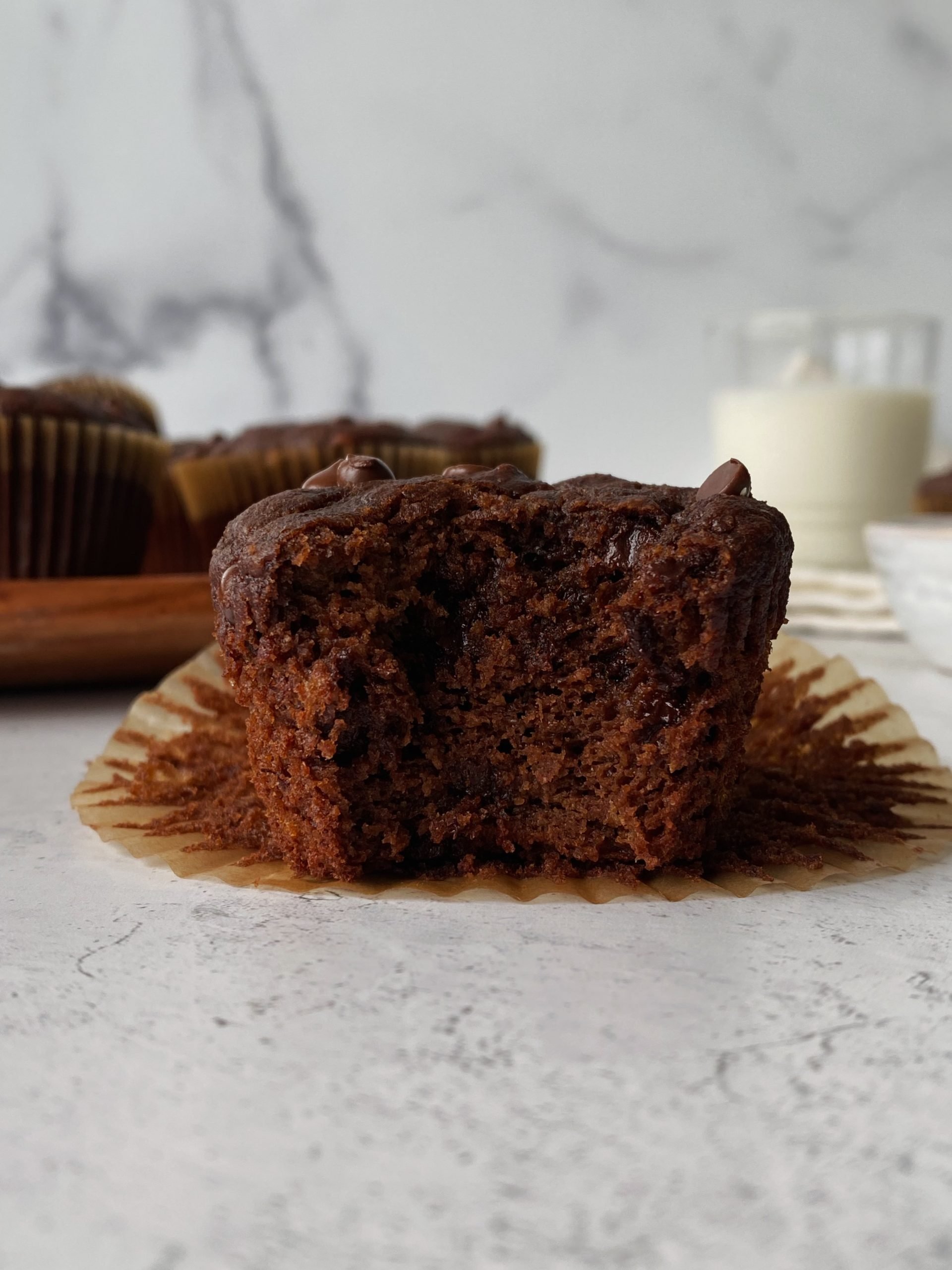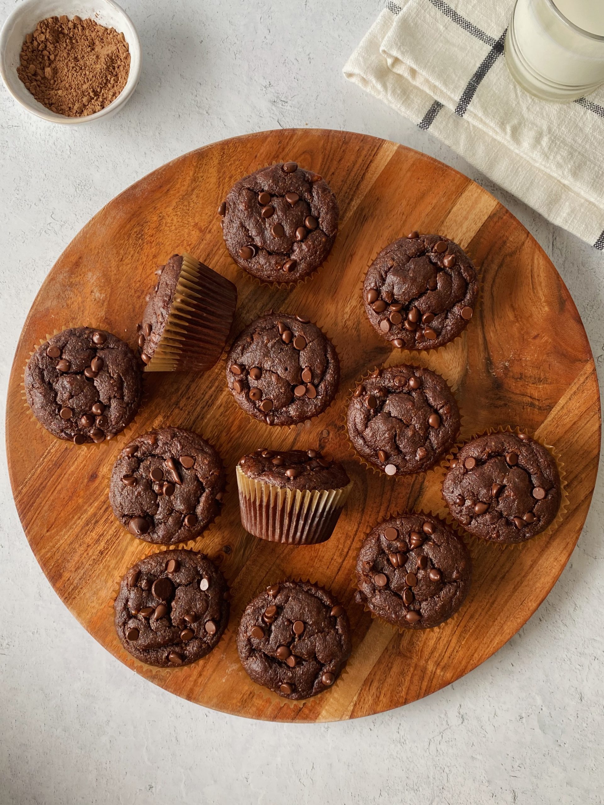 Rich and decadent chocolate banana muffins! These delicious baked treats are gluten and dairy-free, and the perfect way to use up those spotty bananas.