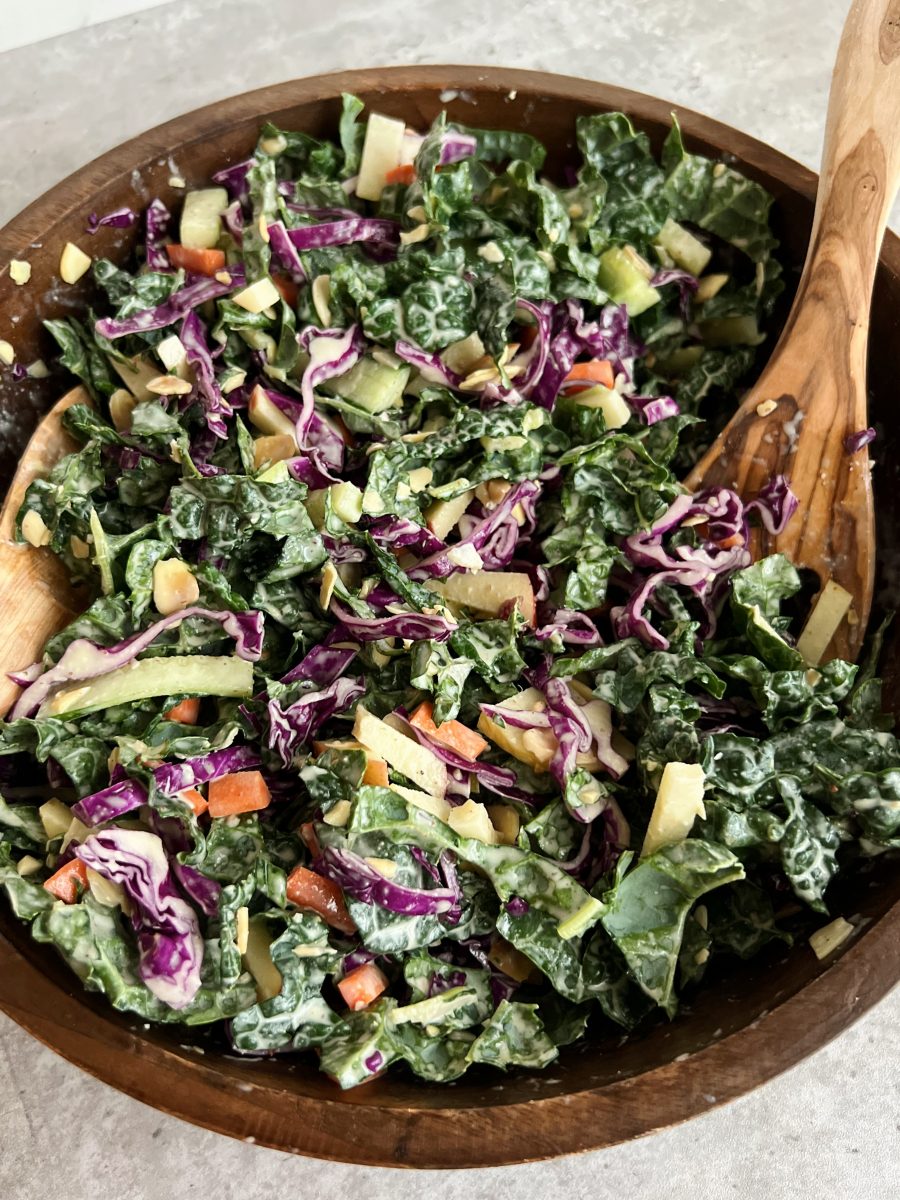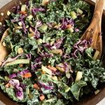 This chopped kale salad is tossed in a creamy sesame tahini dressing, and topped with crunchy veggies like cabbage, carrots and cucumbers. The apple slices and dried cranberries add the perfect sweetness, and the shaved almonds add a delicious crunch.