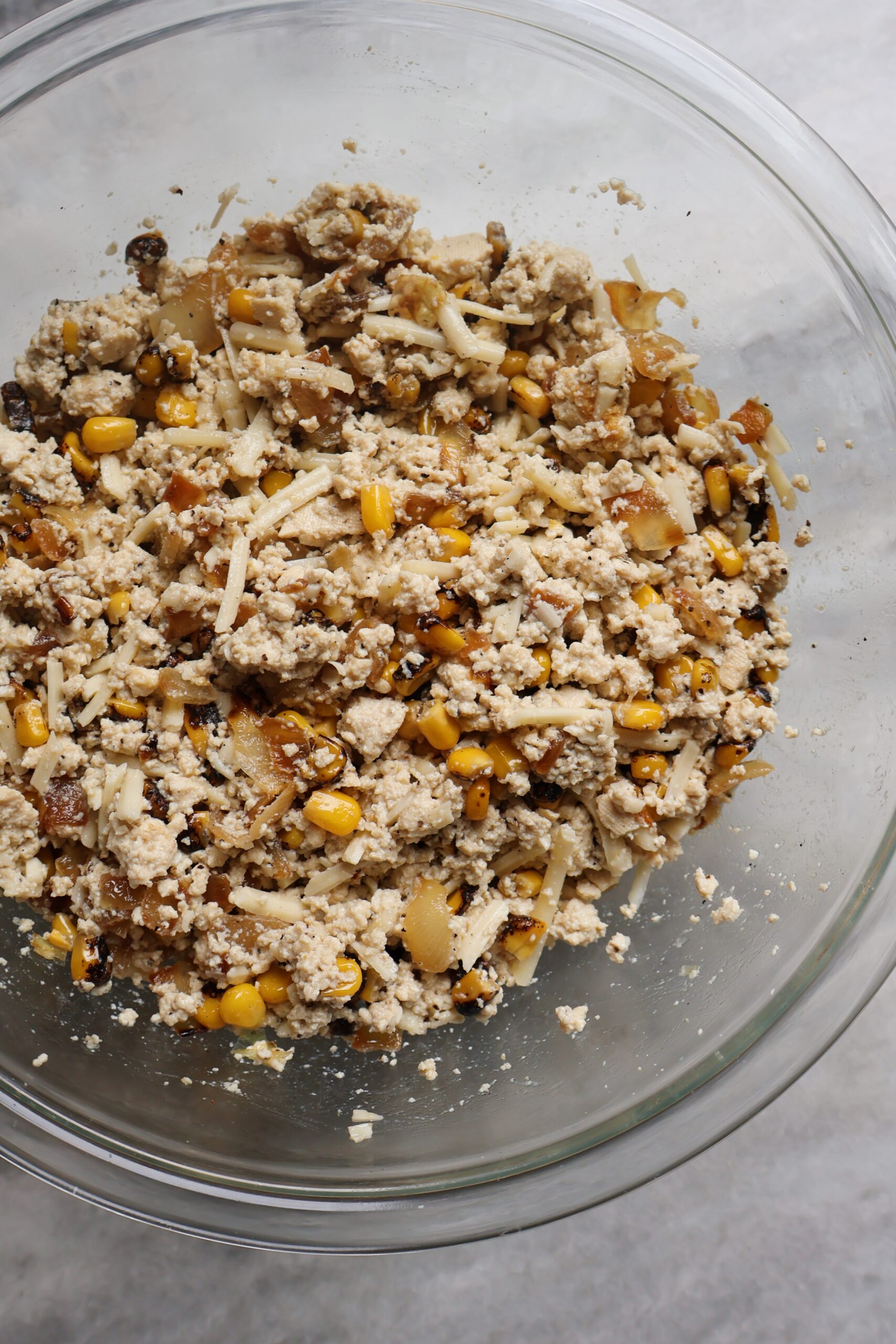 Make your filliing– mash the tofu or blend it, then mix it with the spices, roasted corn, onion and shredded mozzarella cheese. If you prefer a creamier filling, I suggest blending the tofu before mixing it in with the other ingredients