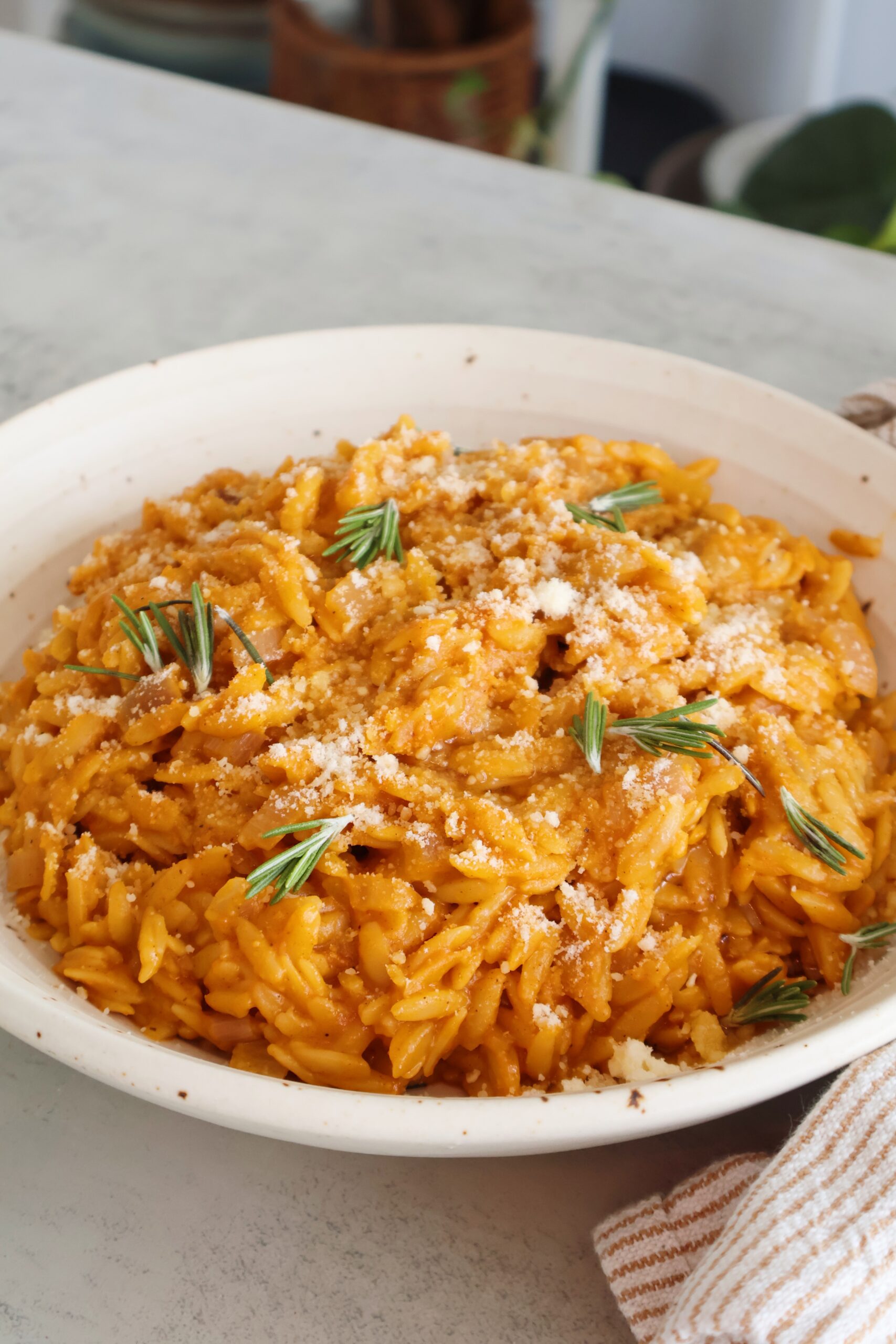 I’m all about cozy recipes this season and this creamy pumpkin orzo just hits the spot for something comforting and nutritious. The sauce is made from a blend of pumpkin puree, tomato paste, coconut milk and broth, and simply seasoned with pumpkin pie spice, salt & pepper.
