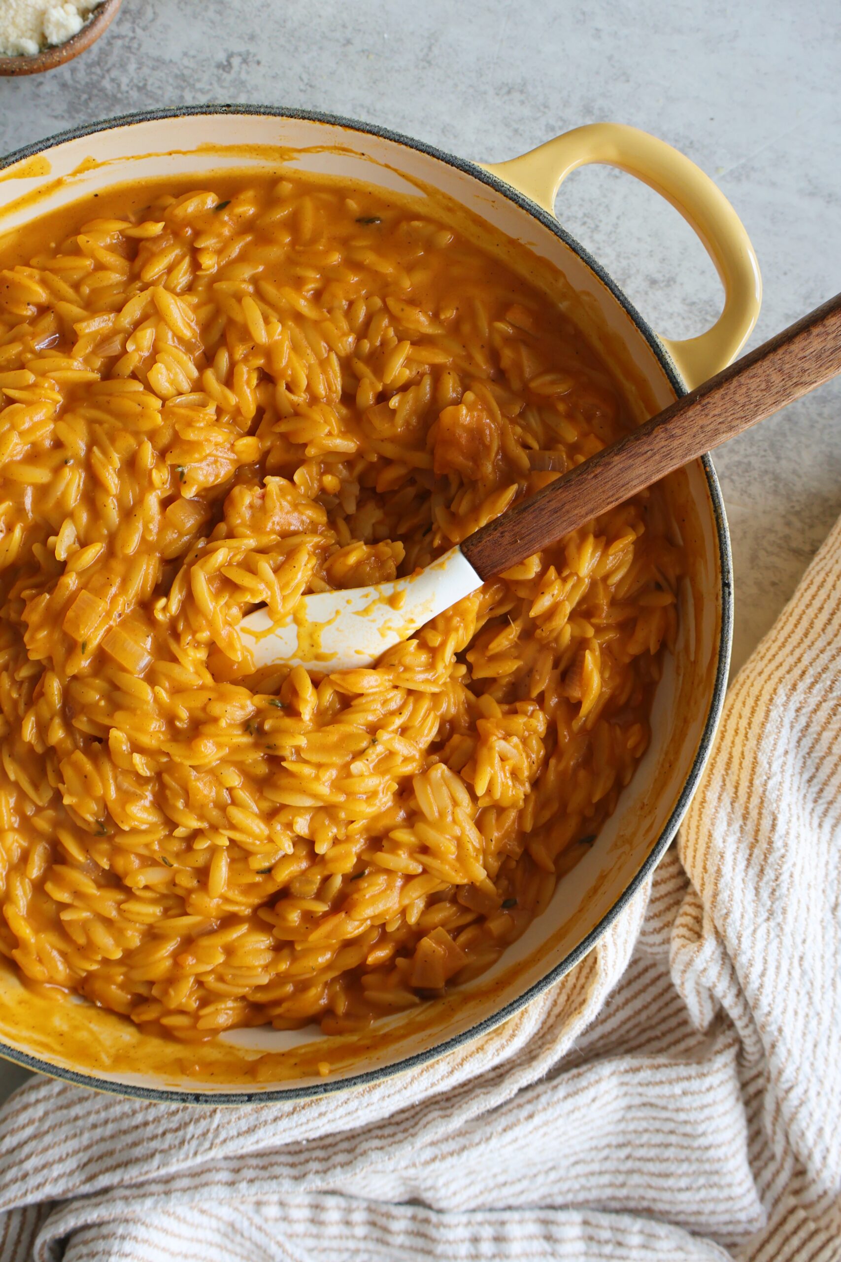 - Toss the onion with the spices, thyme and orzo to toast the orzo, then mix in the pumpkin puree and tomato paste