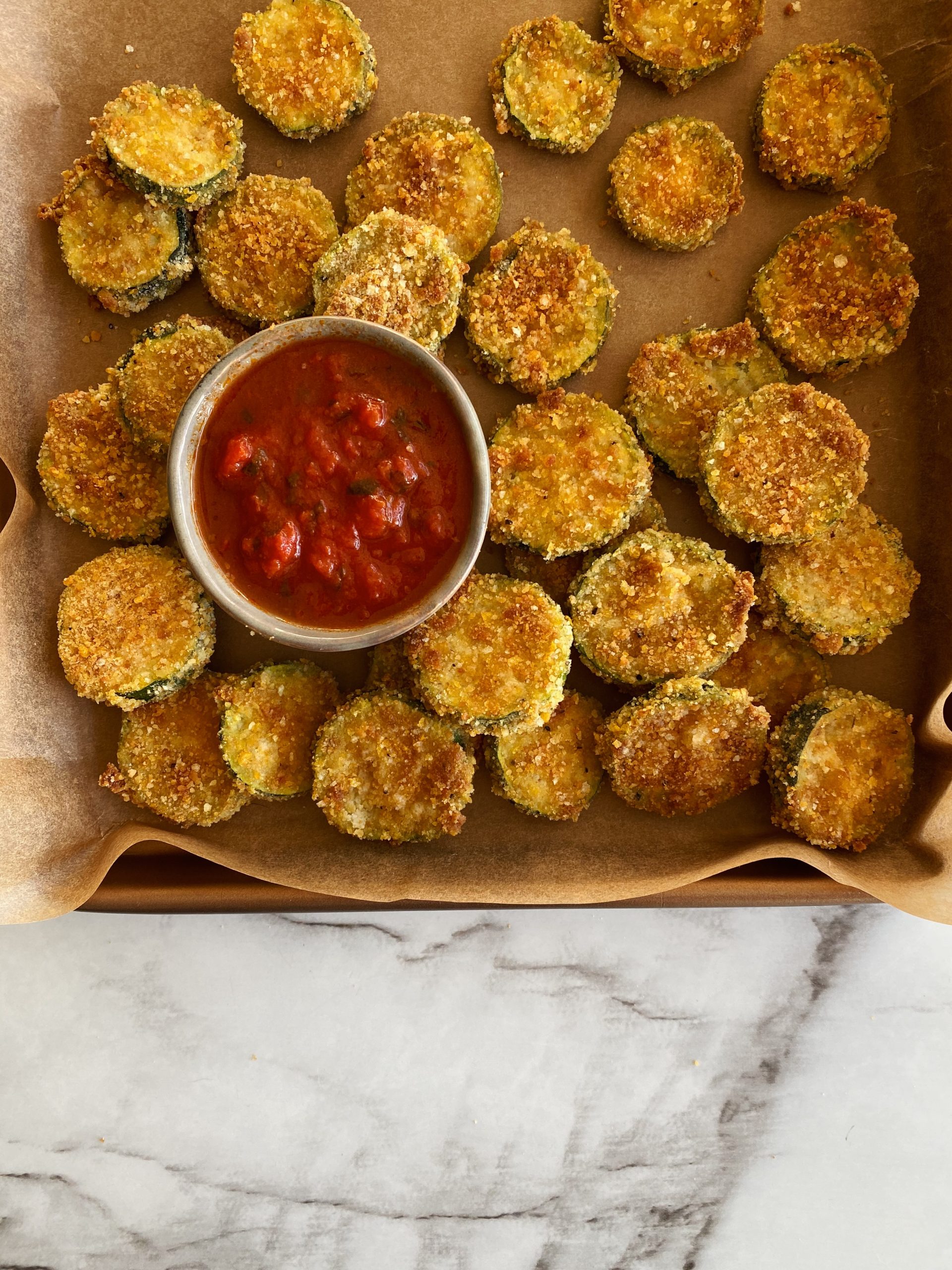 Zucchini chips are such an easy, fun side dish to any meal! I mean, you can’t go wrong with anything thats coated in bread crumbs, but when you hit one of your veggie servings for the day, its a huge win.