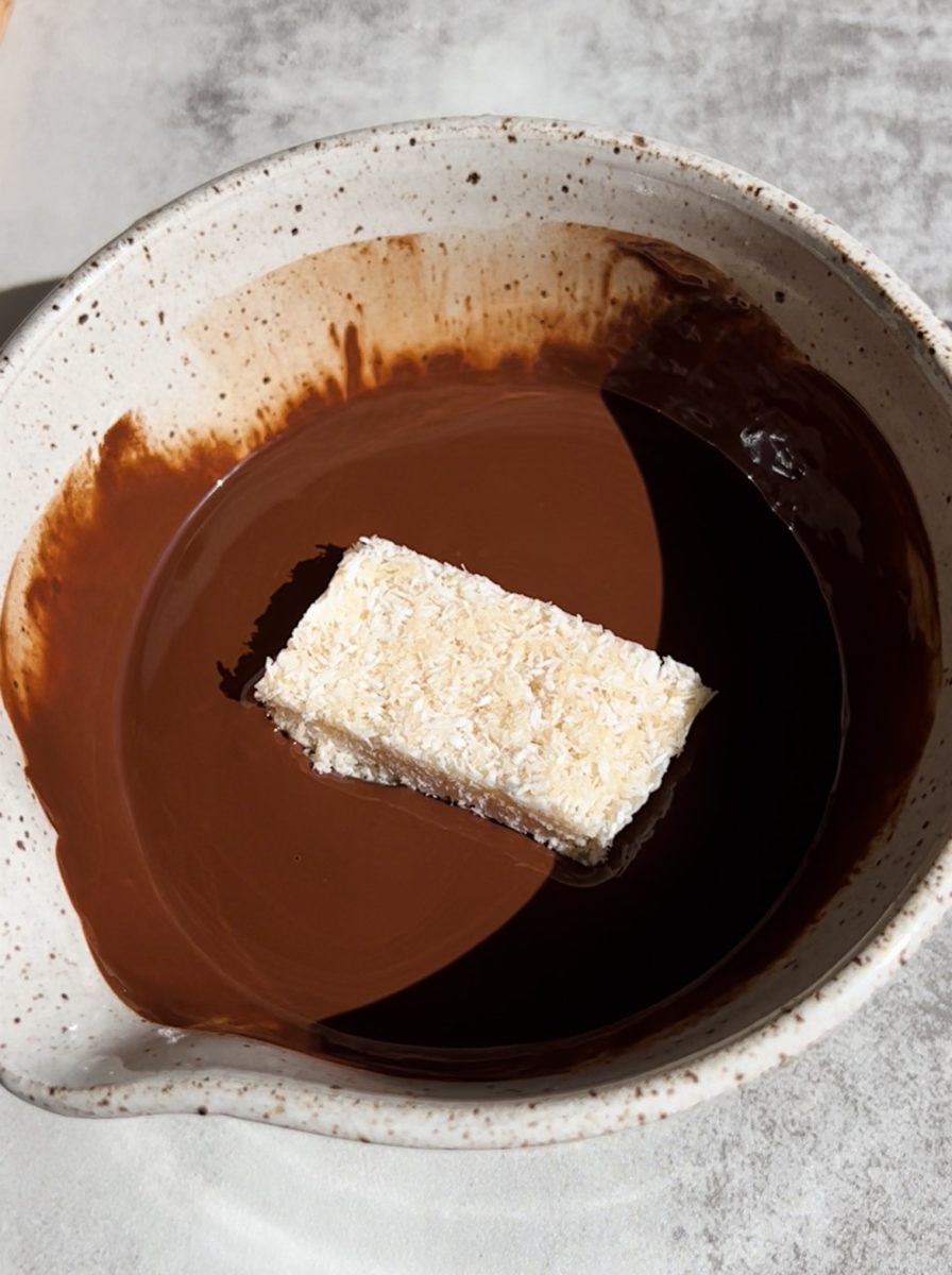 - Slice into 12 bars then dip each bar into the melted dark chocolate