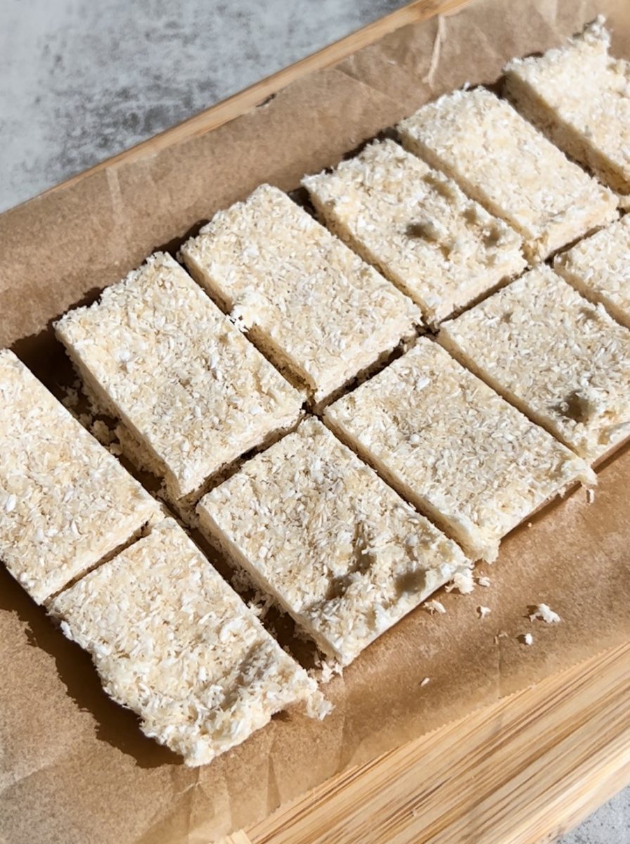 - Once hardened, remove the bars from the freezer. Using a sharp knife, slice into 12 bars.
