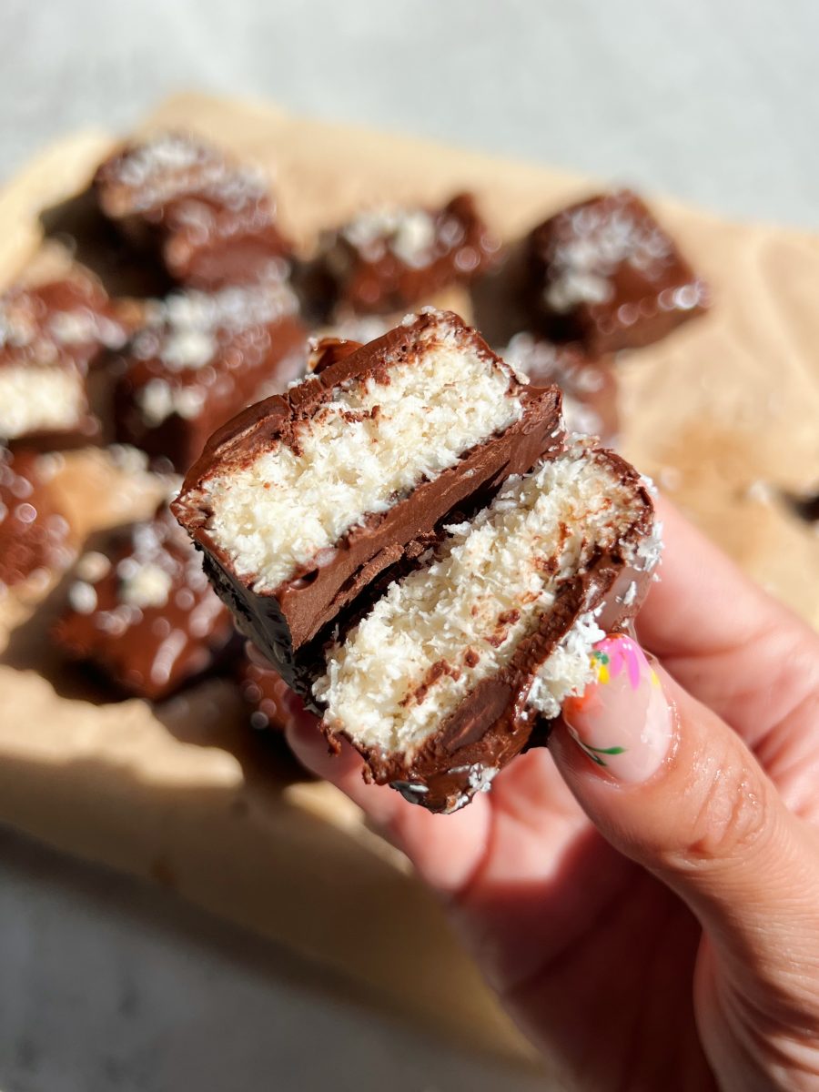 This recipe was inspired by my homemade almond joy bars I shared a few years ago. It combines darks chocolate with a deliciously sweet coconut filling, and is made with only 6 ingredients.