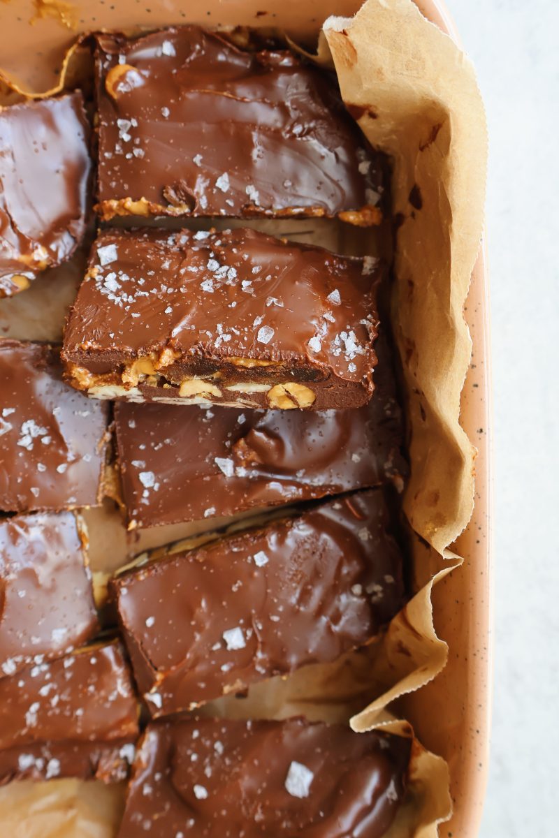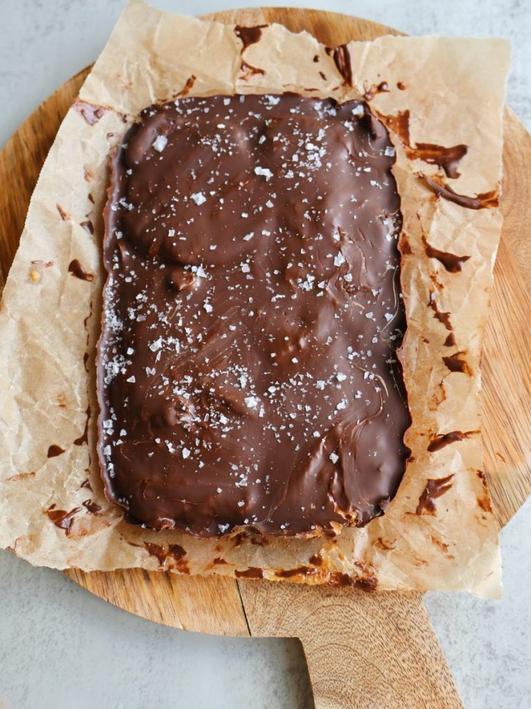- Set the bars in the freezer to set, top with flakey salt then slice and enjoy!