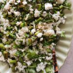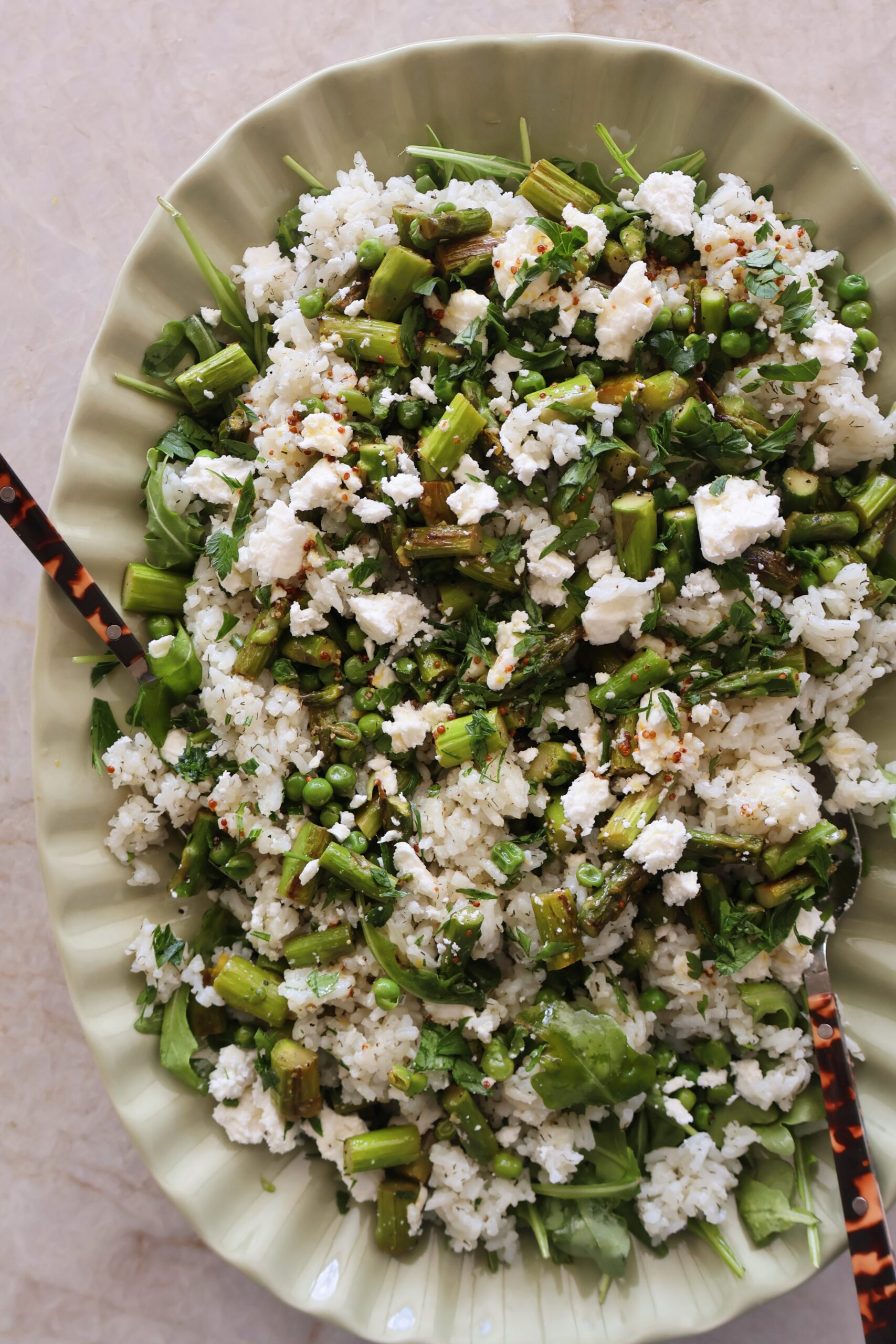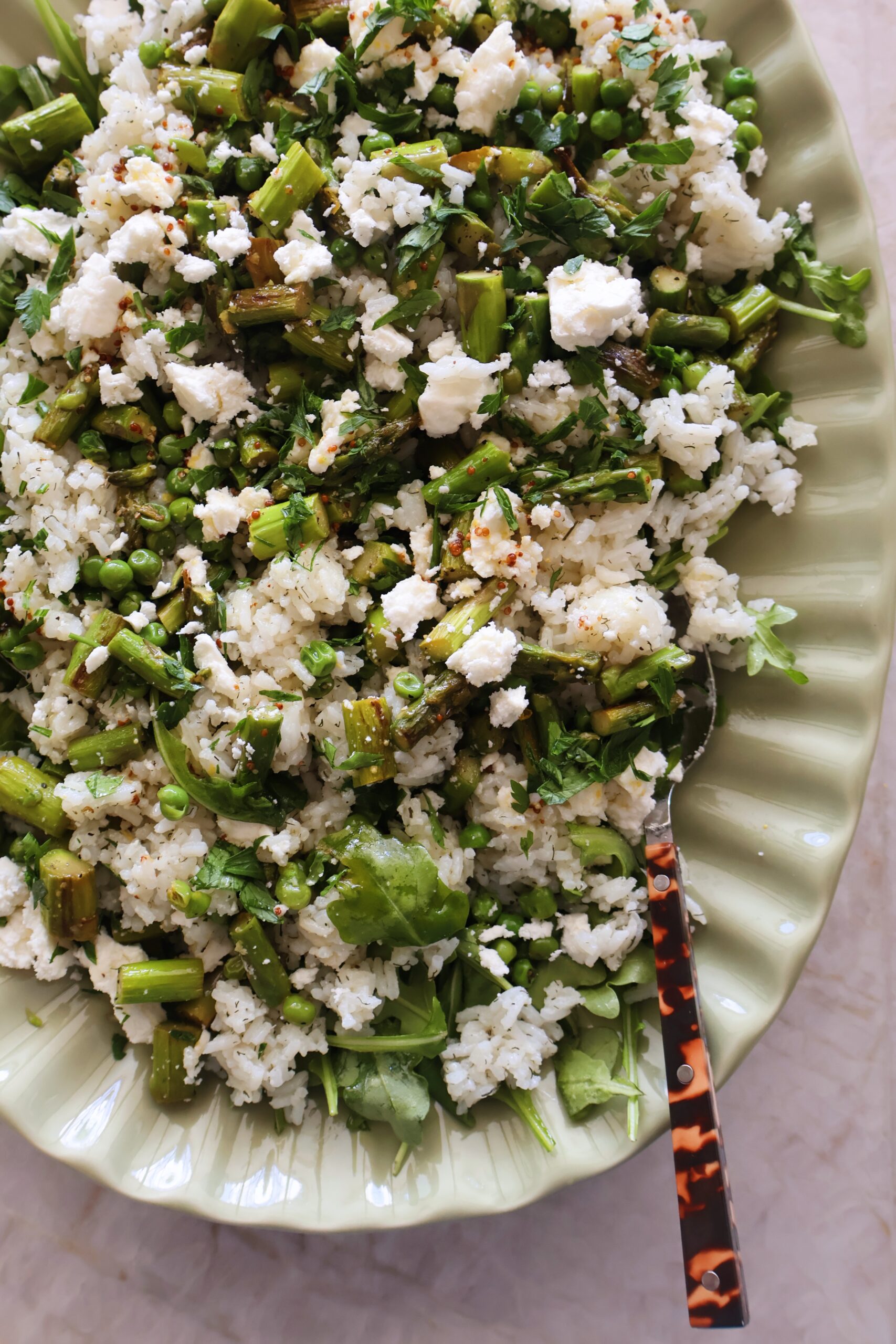 - To serve, I like to assemble the salad on a large platter. Start with the arugula mixed with ⅓ of the dressing. Layer the rice on top, then the sauteed peas & asparagus, crumbled feta cheese and parsley. Pour the remaining dressing over the top. Best served freshly made or at room temperature.