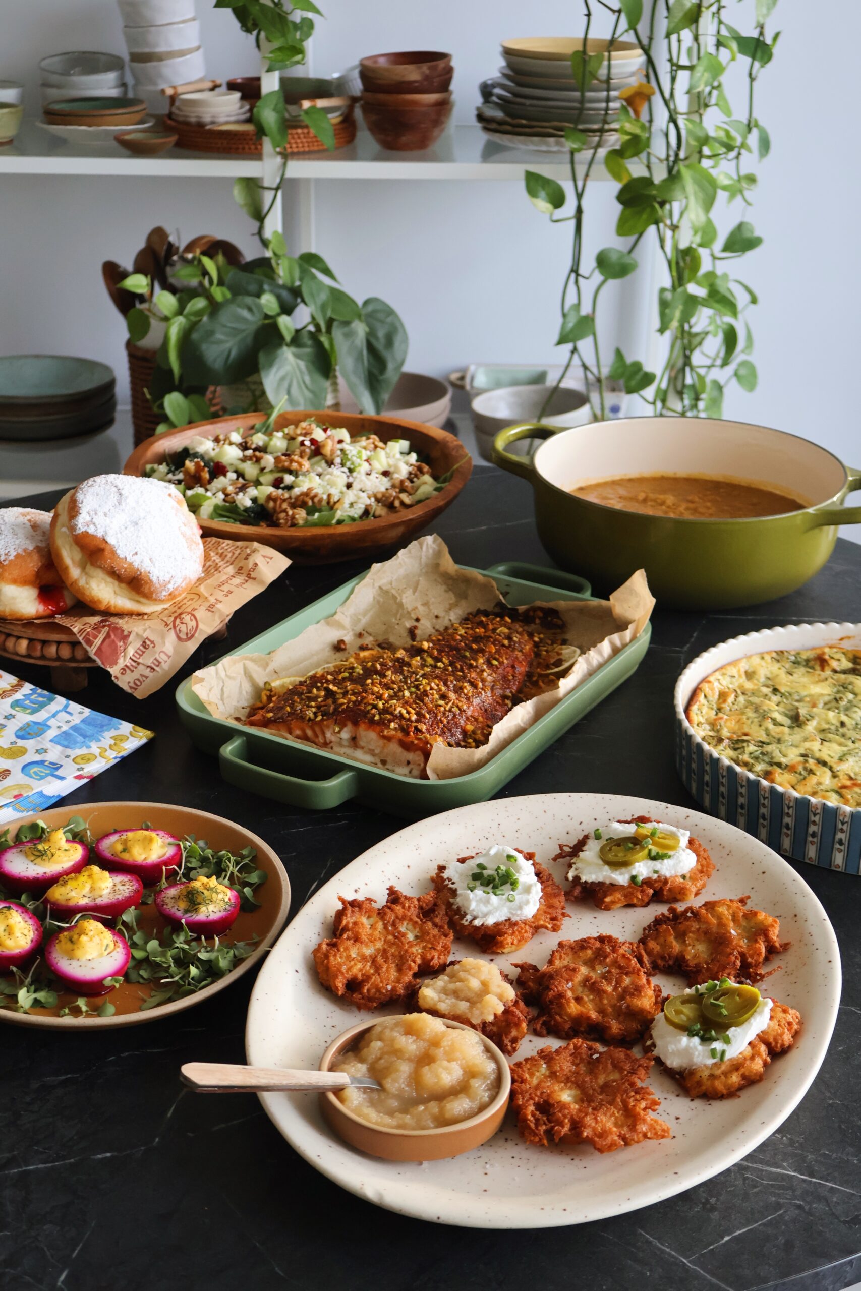 The Jewish holiday of Hanukkah calls for eating all the fried goods- like latkes and jelly donuts, aka sufganiyot, which I love to pair with a main course and a few sides as a holiday meal.