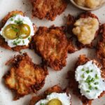 For this year’s menu, I served these latkes with my BBQ Pistachio Crusted Salmon, Kale Apple Salad, Pickled Beet Deviled Eggs and my creamy Red Lentil Soup.