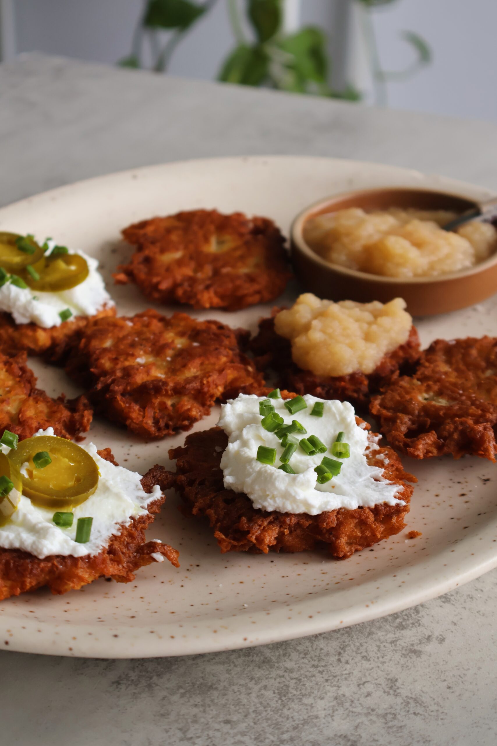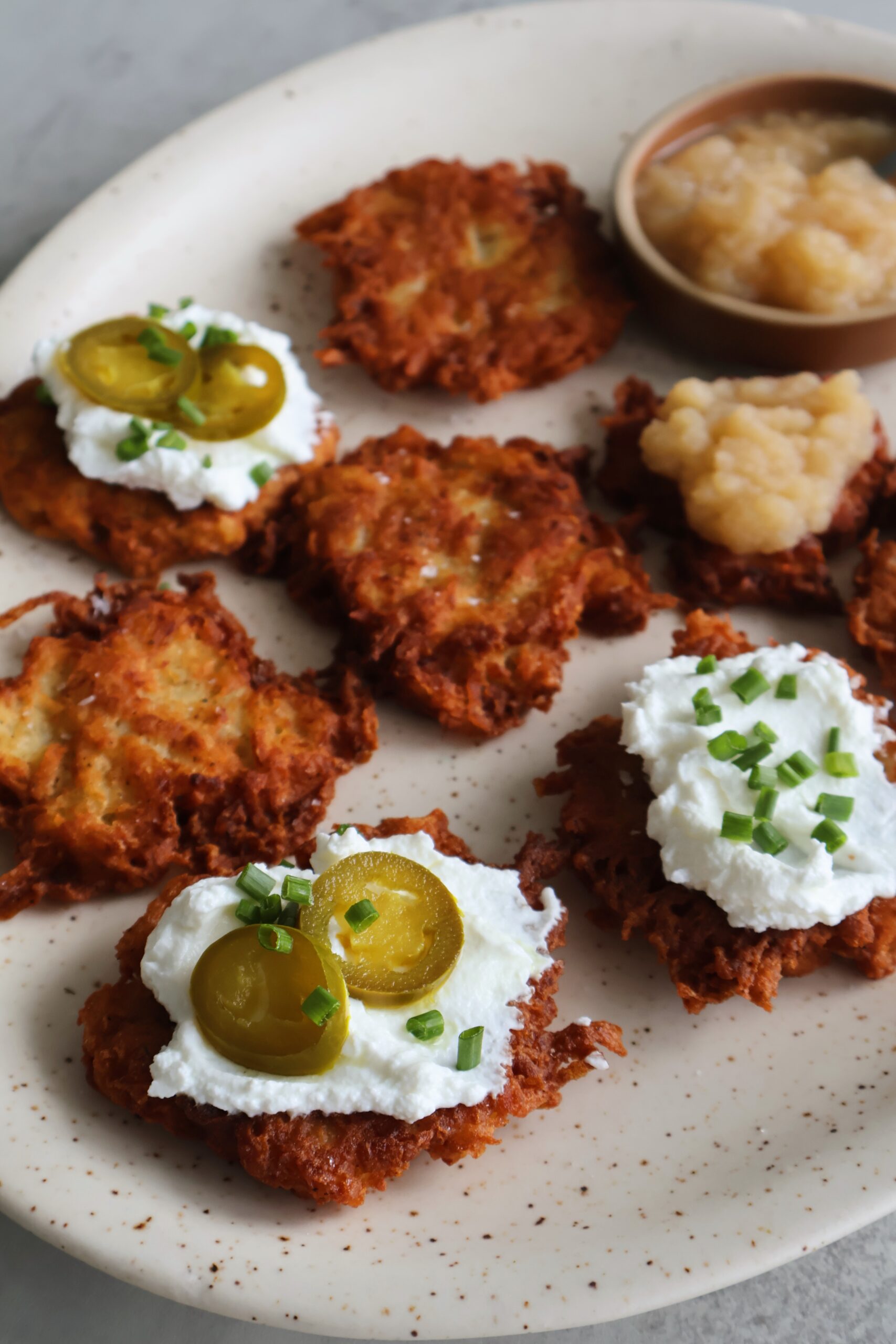If you haven’t already, be sure to check out my Sweet Potato Apple Latkes for a sweeter version of the classic latkes. Serve them with applesauce (my fave!), sour cream, or any topping you like.