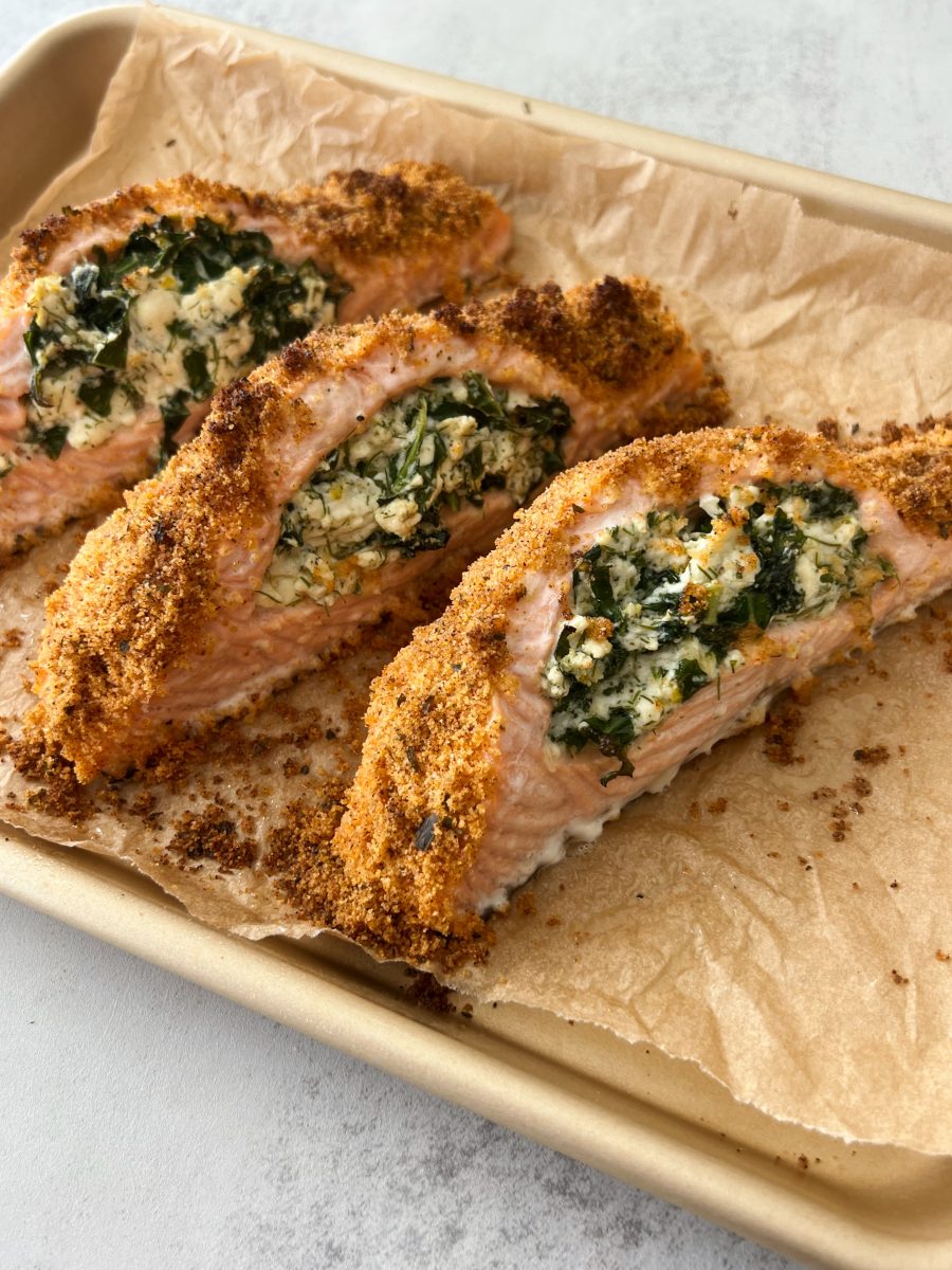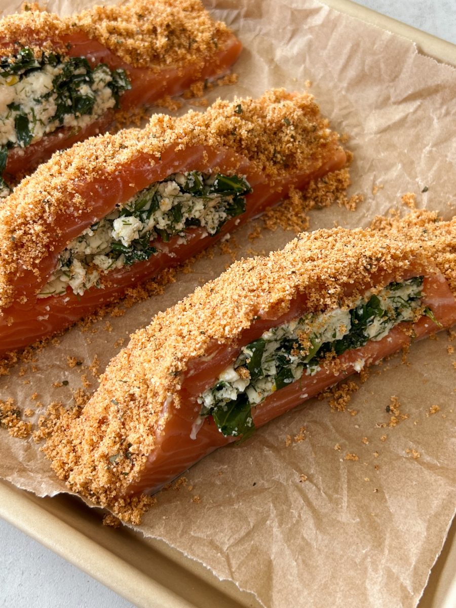 If you’ve never heard of feta stuffed salmon, you’re in for a treat with this 30 minute recipe. The feta and sauteed kale come together to make a creamy filling to stuff salmon fillets with, and the bread crumb topping adds the perfect crunch.