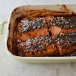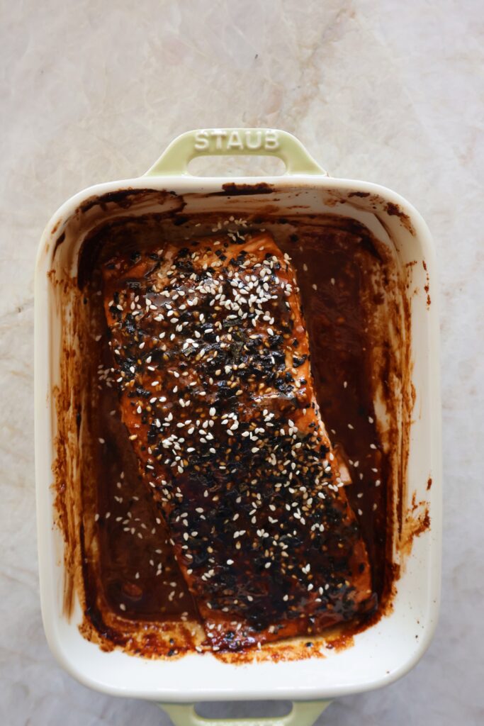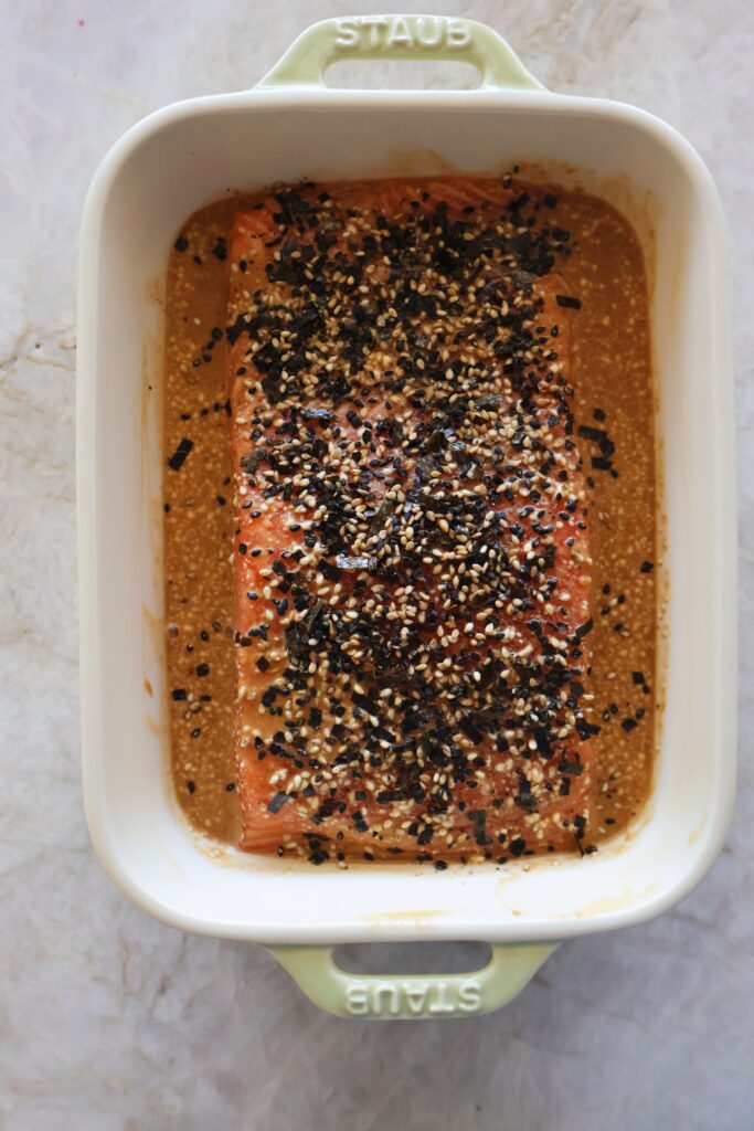 When baked, the sesame seeds toast up and the seaweed gets crisp. It’s a delicious topping for this salmon recipe.