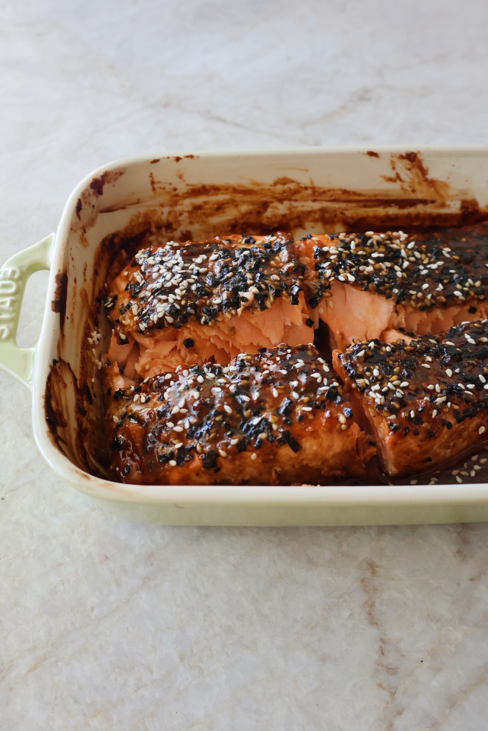 The salmon comes out sweet and savory, baked in a marinade made of mayo, soy sauce, maple syrup, furikake and garlic. It takes only 5 minutes of prep time, and is a flavor-packed recipe the whole family can enjoy.