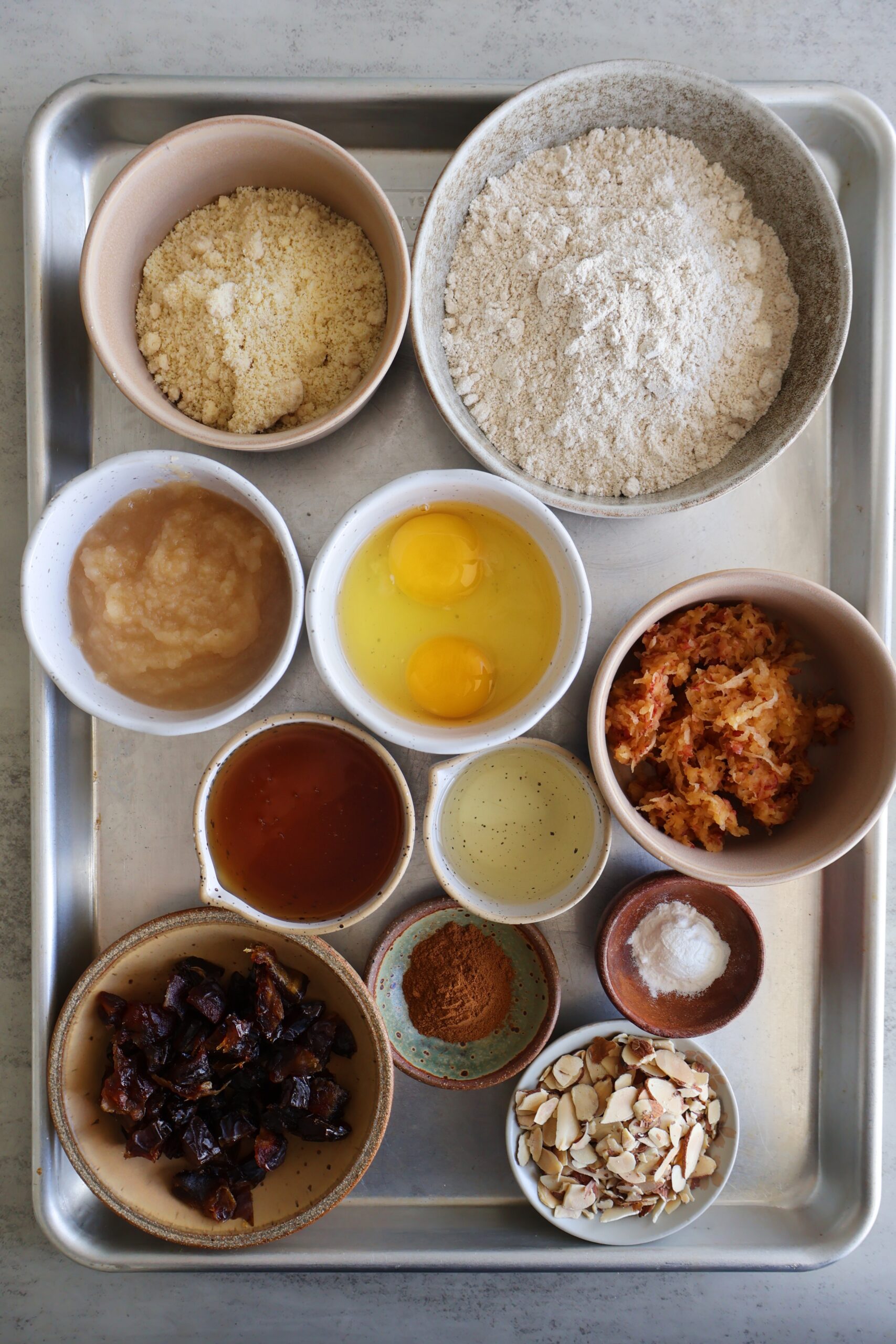 This delicious gluten-free apple date honey cake is the perfect dessert to make for any occasion. It’s fluffy and moist, and filled with warm apple cinnamon flavor. Sweetened with honey and applesauce, and topped with chewy pieces of medjool dates and toasted sliced almonds.