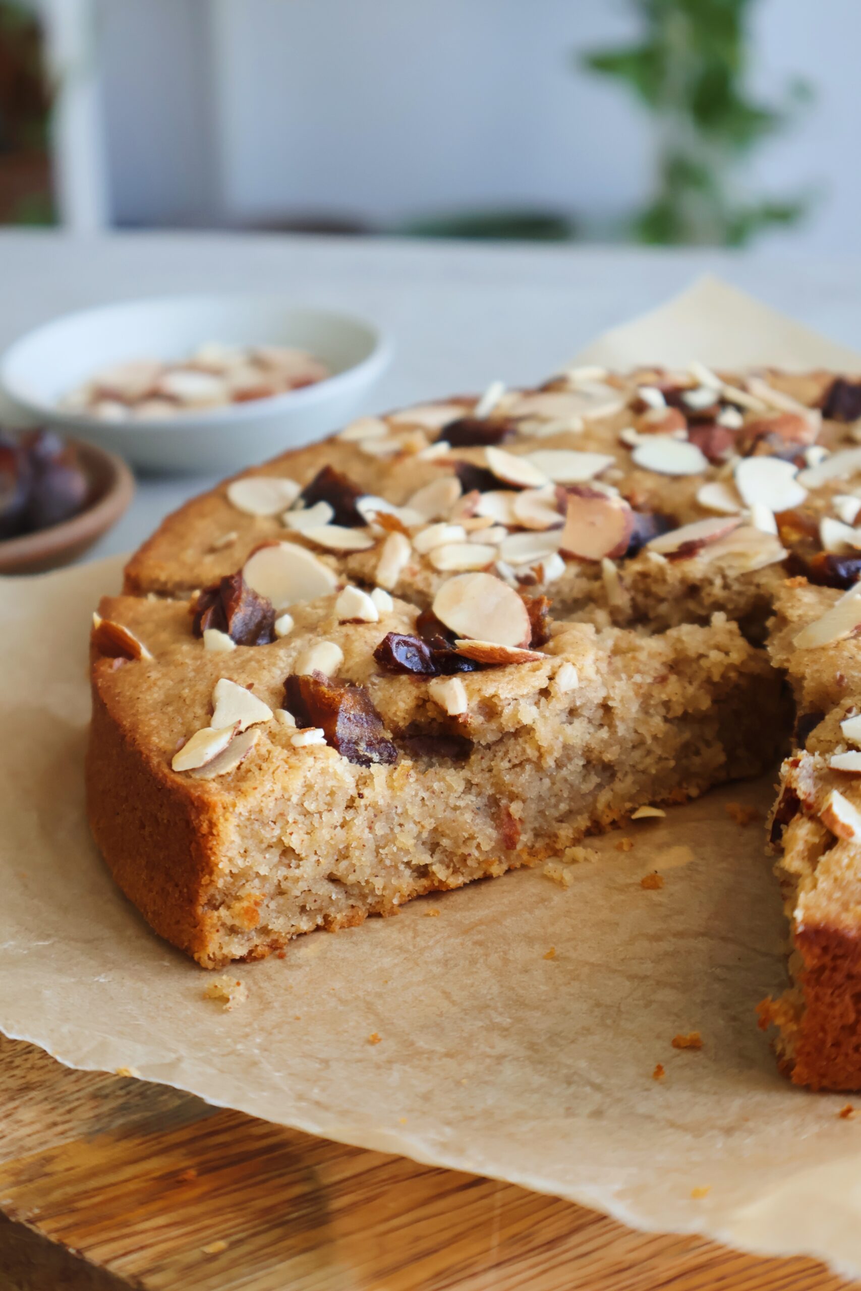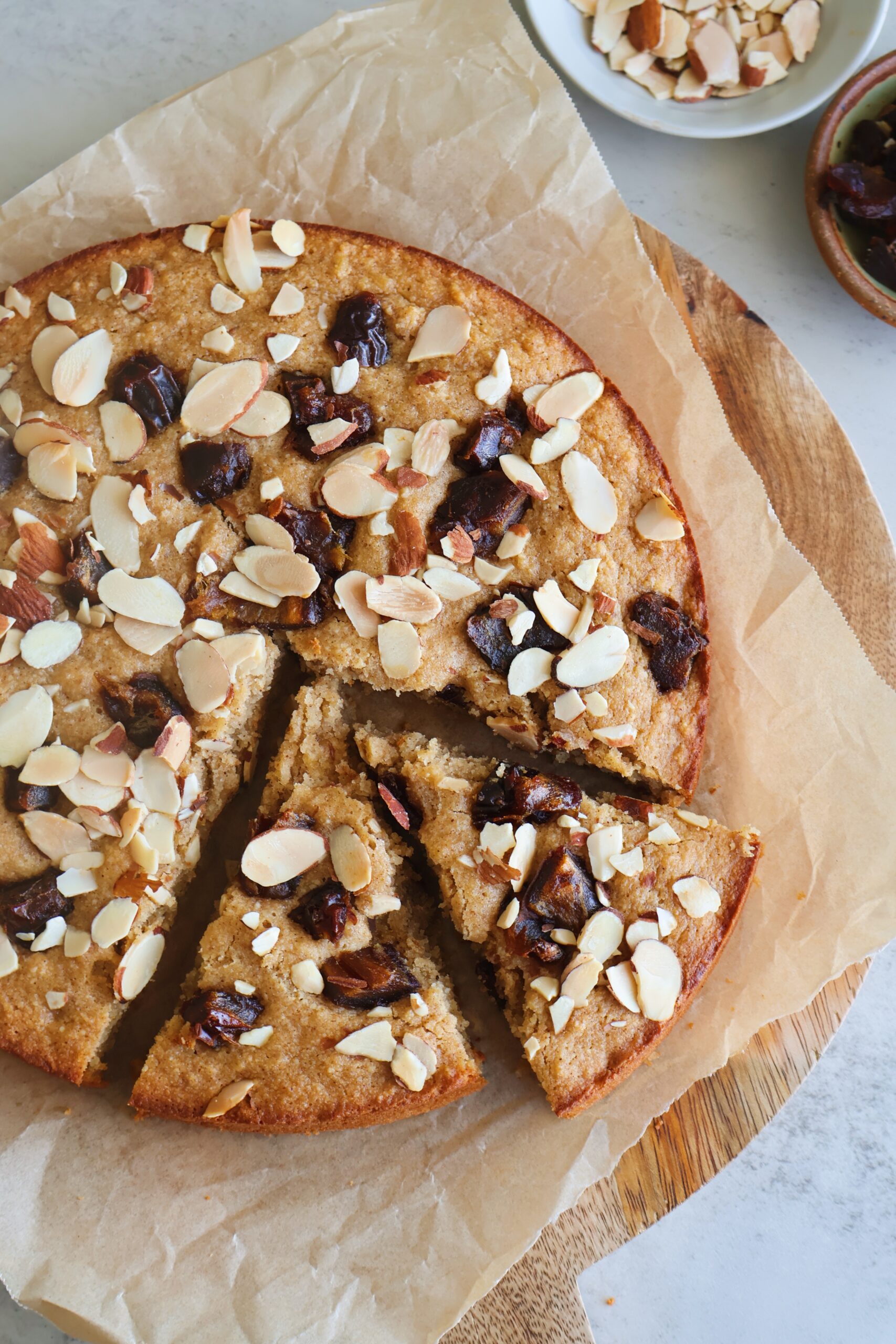 - Top with the chopped dates and almonds. Bake for 30 minutes until the top if firm to touch.