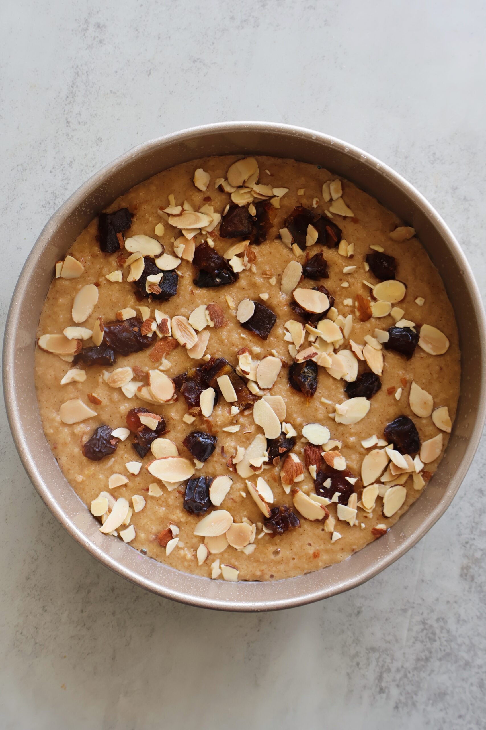 Combine everything together then pour it into your cake pan. Top with chopped dates and sliced almonds, and bake on 350 F for 30 minutes.