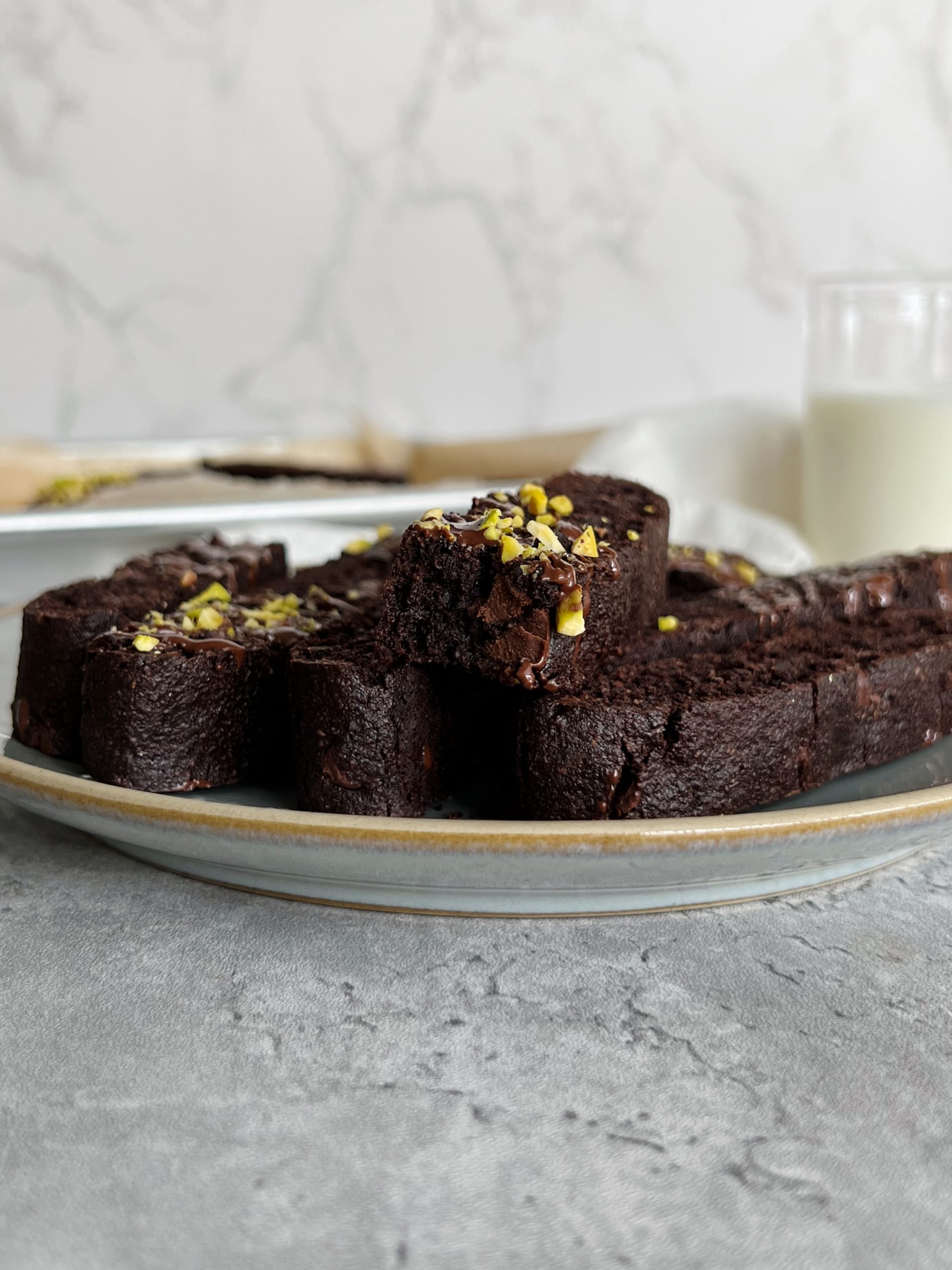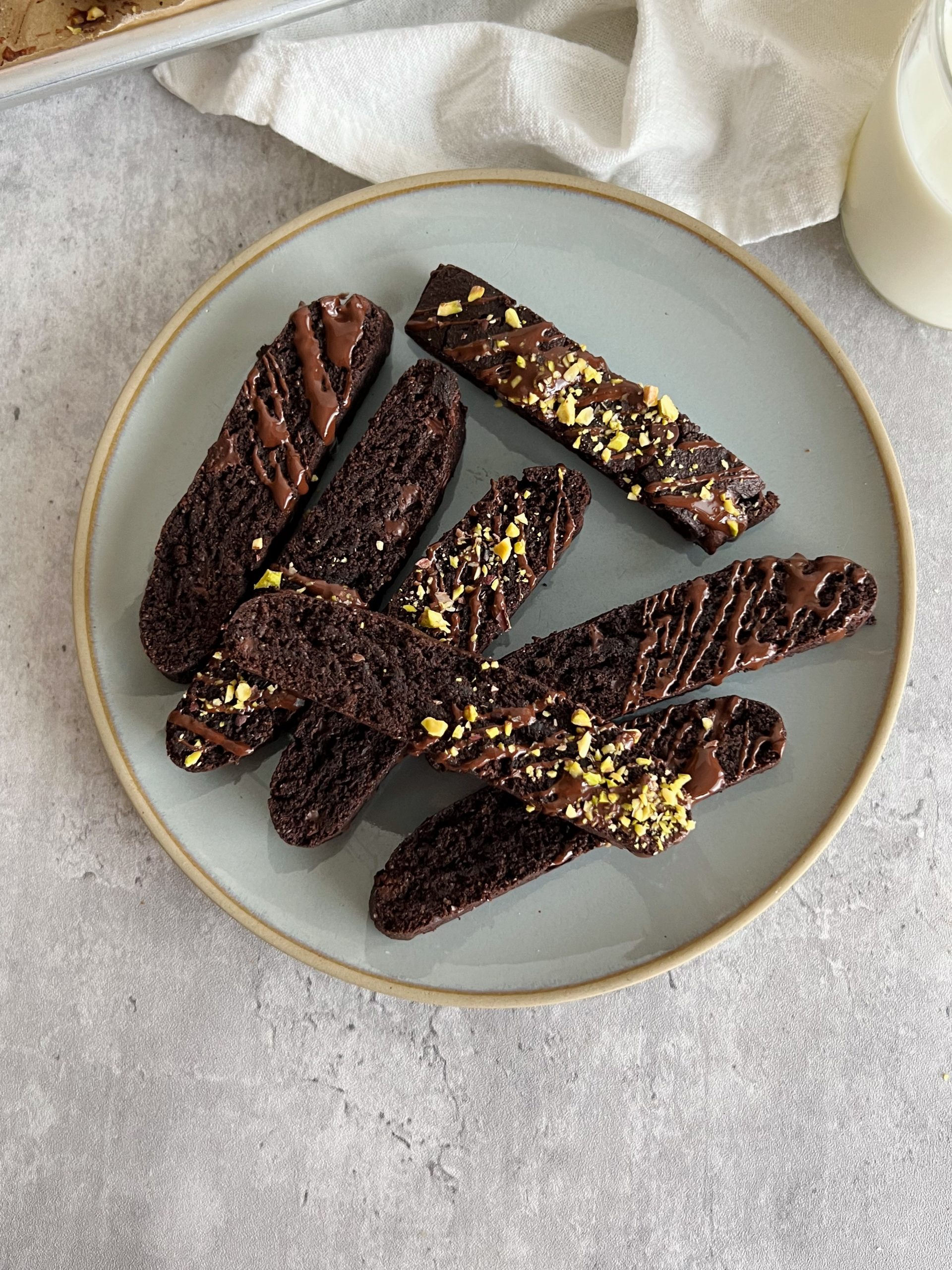 These gluten-free chocolate biscotti are the perfect cookie to pair with a warm cup of coffee or tea. The have a rich chocolate flavor and are topped with melted dark chocolate and crushed pistachios for a delicious flavor combo.