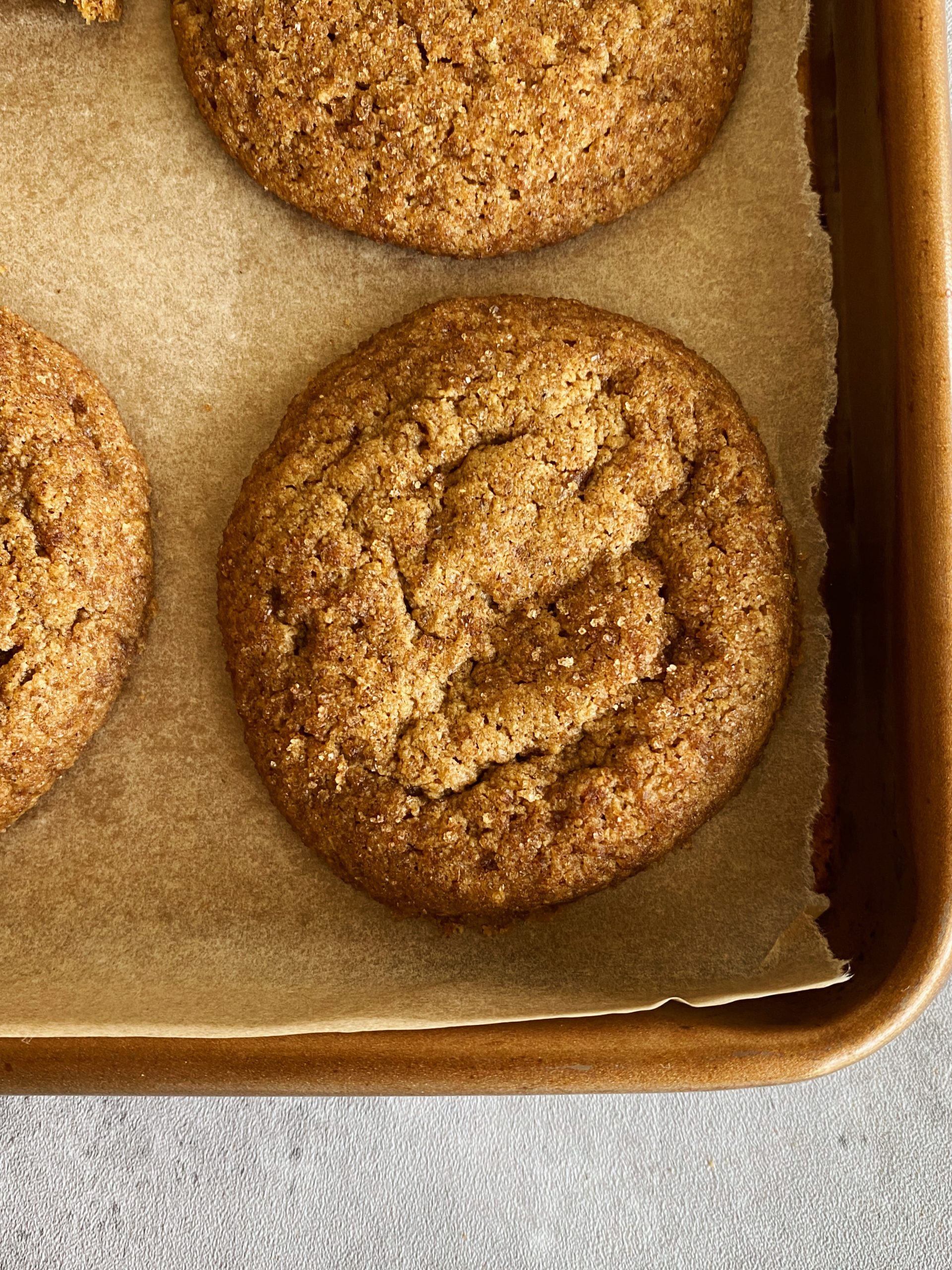 - Bake the cookies for 10-12 minutes. Once you remove them from the oven, you can flip a large mug or ramekin over each cookie while they’re still on the pan and gently swirl them around 1-2 times to round out any uneven edges.