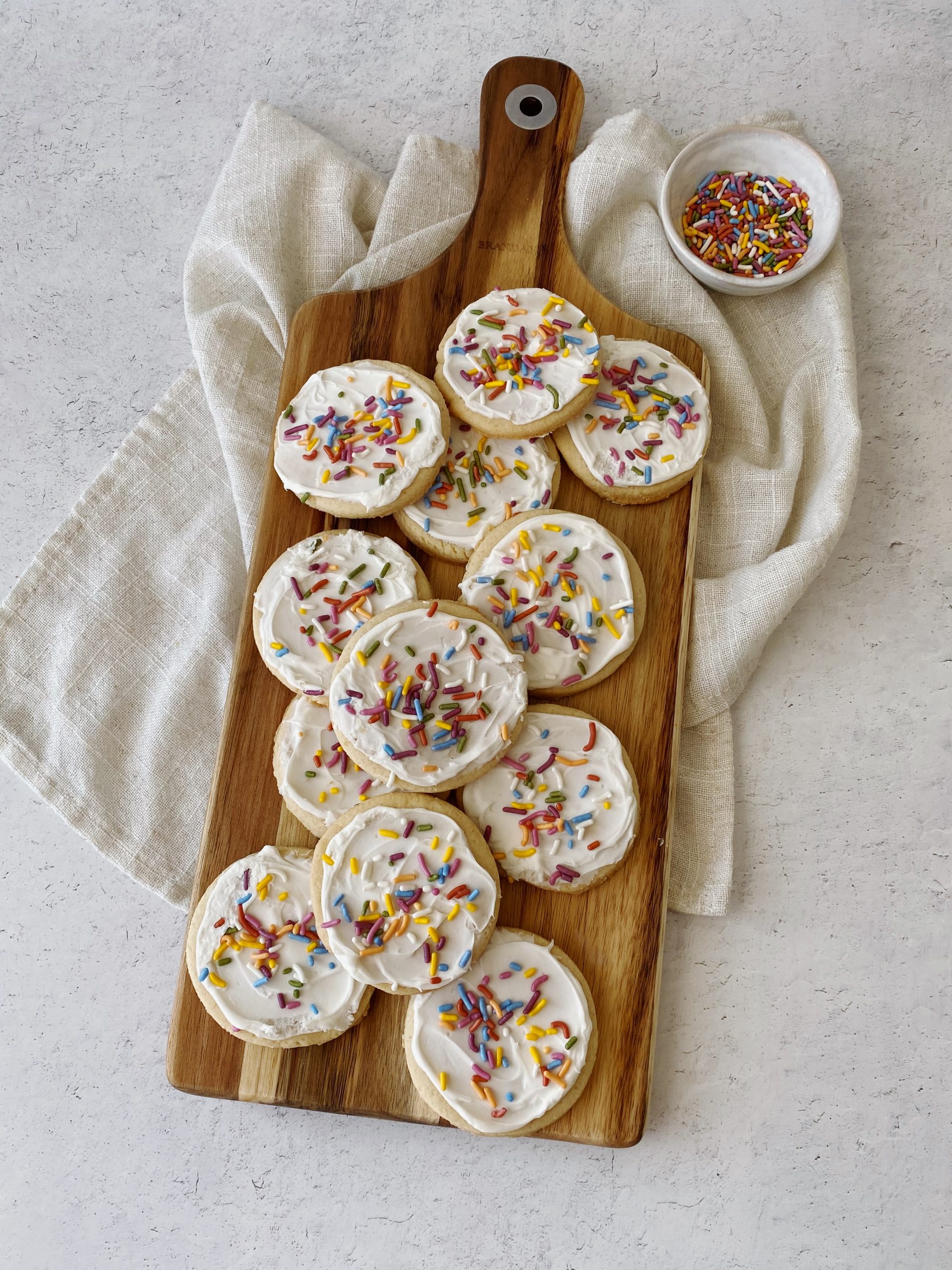 The most delicious, gluten-free sugar cookies are kicking off day 3 of cookie week right in time for your holiday baking! They have soft-baked centers with crispy edges, and are topped with one of my favorite store-bought vanilla icings and rainbow sprinkles.