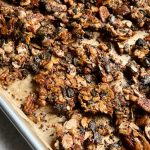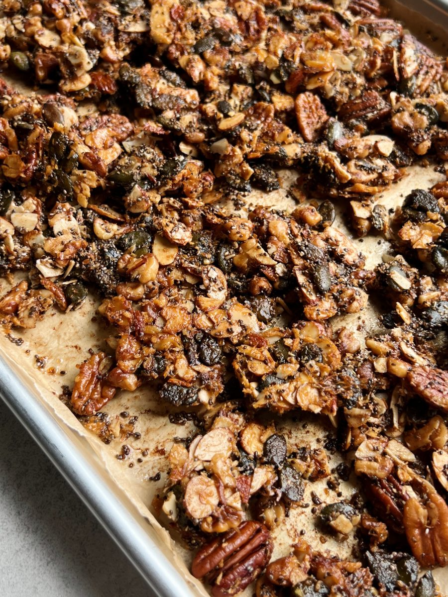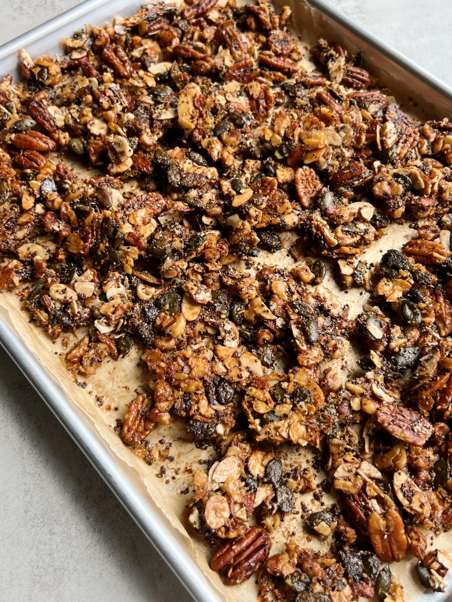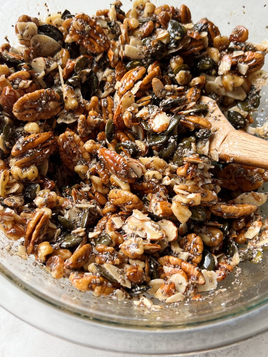 The nuts and seeds get mixed with a maple syrup and coconut oil glaze and come out so crispy and crunchy.