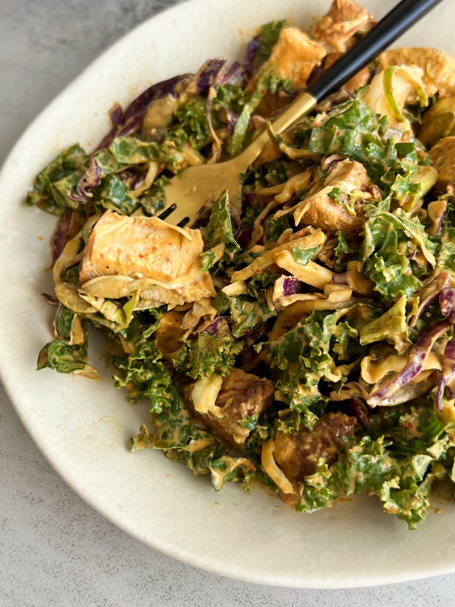 Kale salads are by far the superior salad. They’re so versatile and even make for the best leftovers. This hearty kale salad has seasoned grilled chicken, avocado, pumpkin seeds, dried cranberries and a creamy spicy tahini dressing.