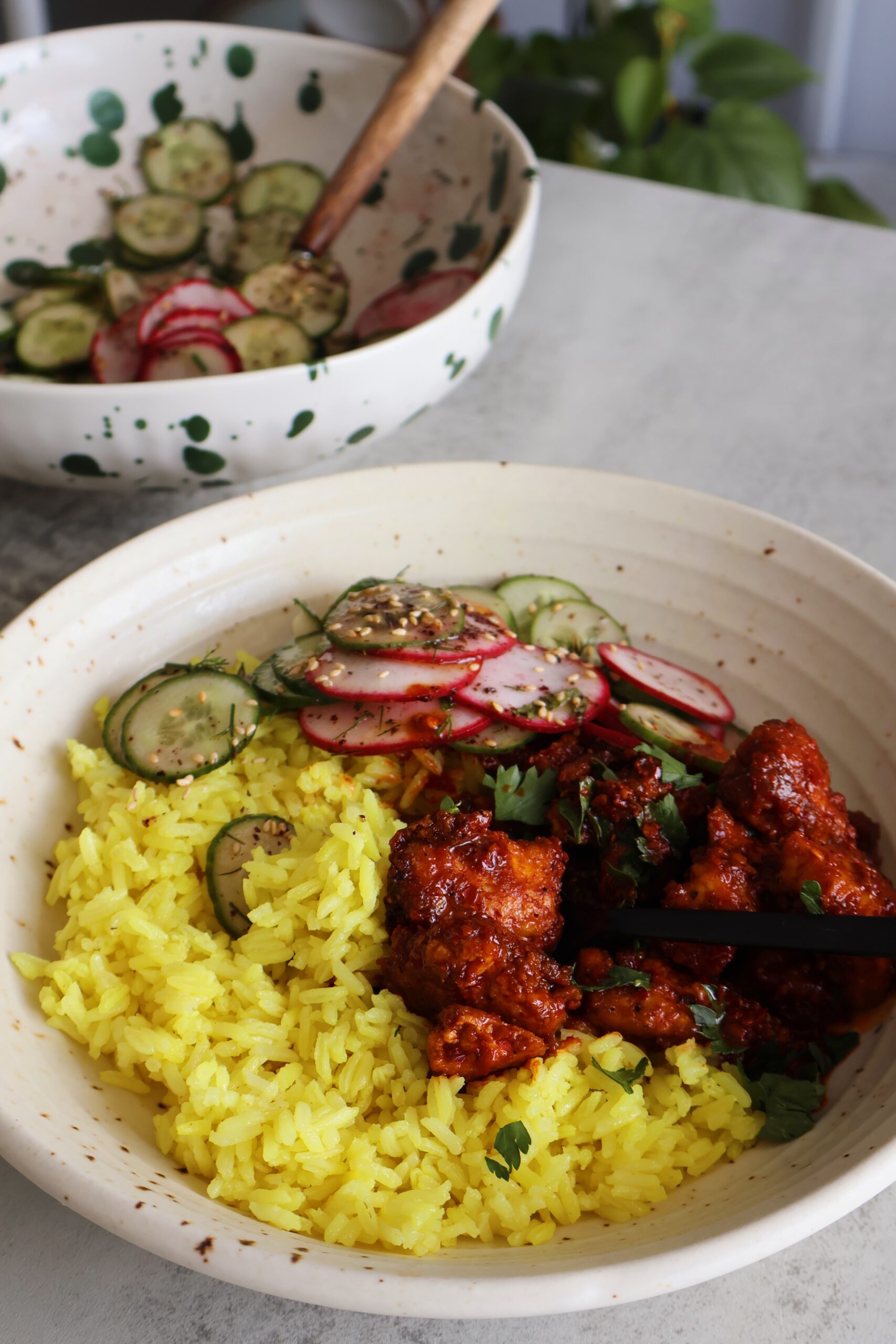 These tofu bowls pack in delicious flavor from all of the components. The crumbled tofu nuggets are tossed in a sweet and spicy harissa glaze, the fluffy turmeric rice has hints of garlic and serves as the ideal base for the tofu, and the cucumber radish salad adds a crunchy freshness to finish it all off.