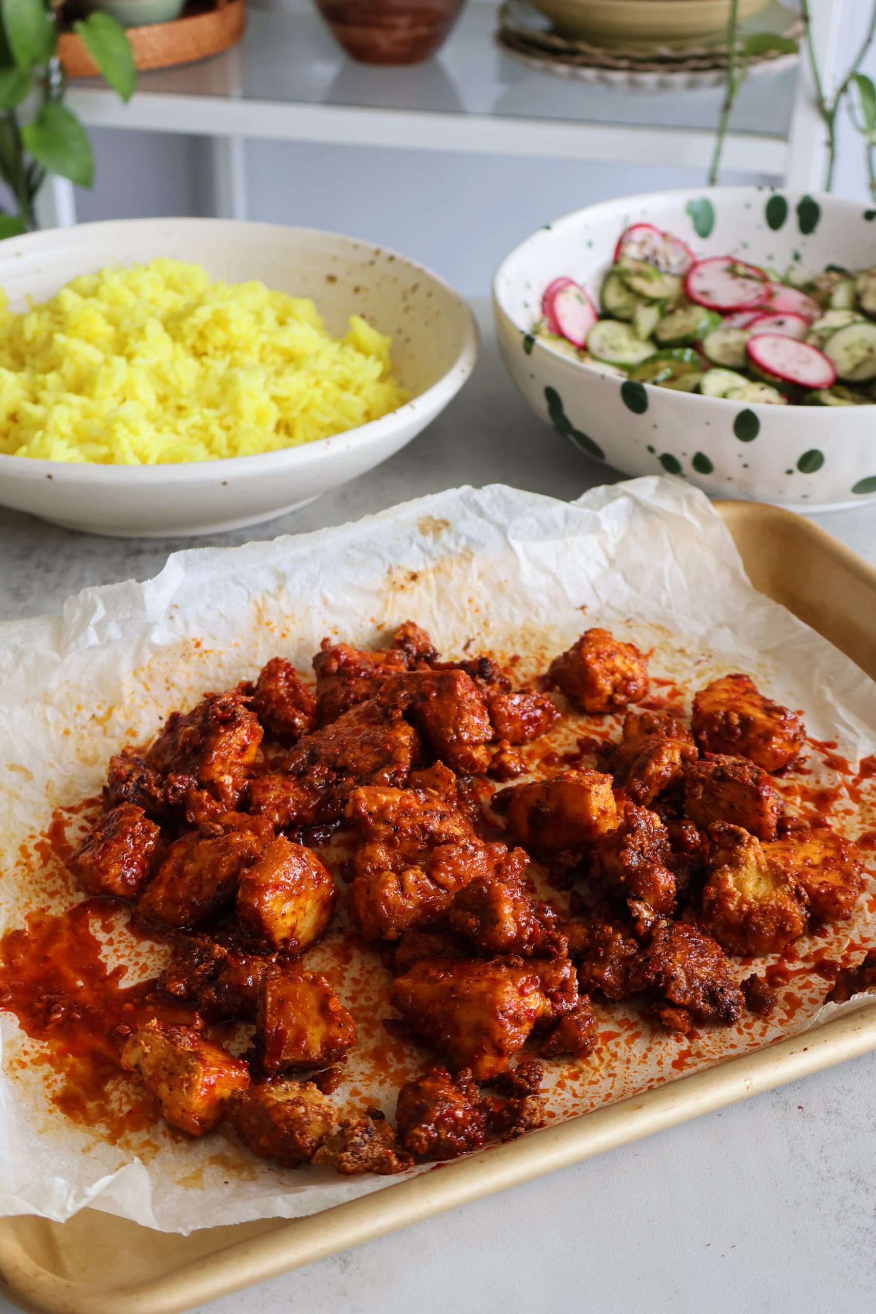 Crispy harissa tofu served over fluffy turmeric rice with a crunchy cucumber radish salad. A simple recipe inspired by Middle Eastern flavors that’s perfect for a plant-based dinner!