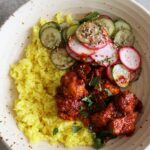This recipe is a true winner even for meat eaters. The sauce is spicy and has a little tang, and delicious over the turmeric rice with the cucumber salad for a well-rounded dinner.