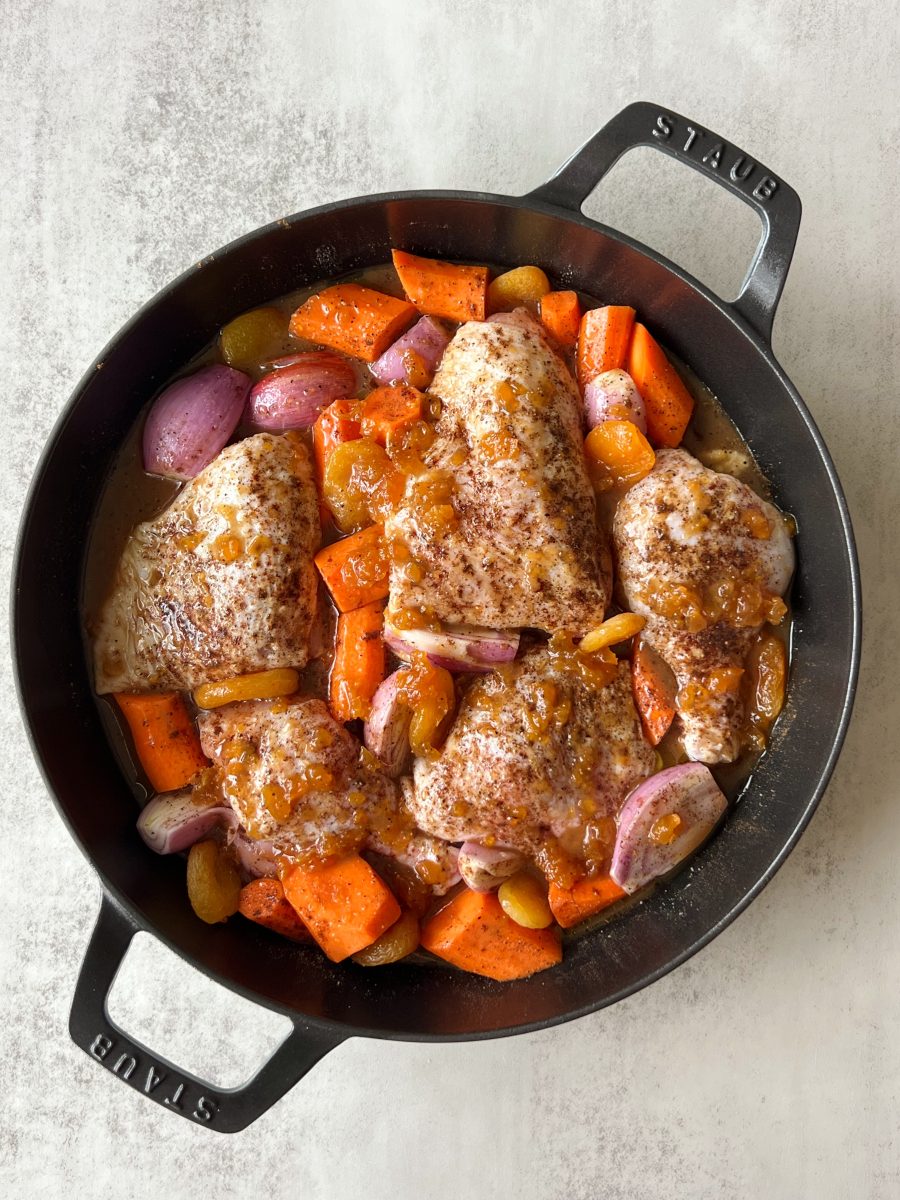 - Layer the chopped carrots, sliced shallots, apricots and chicken in your baking dish. Generously drizzle with olive oil and season with salt, pepper, cumin and cinnamon.