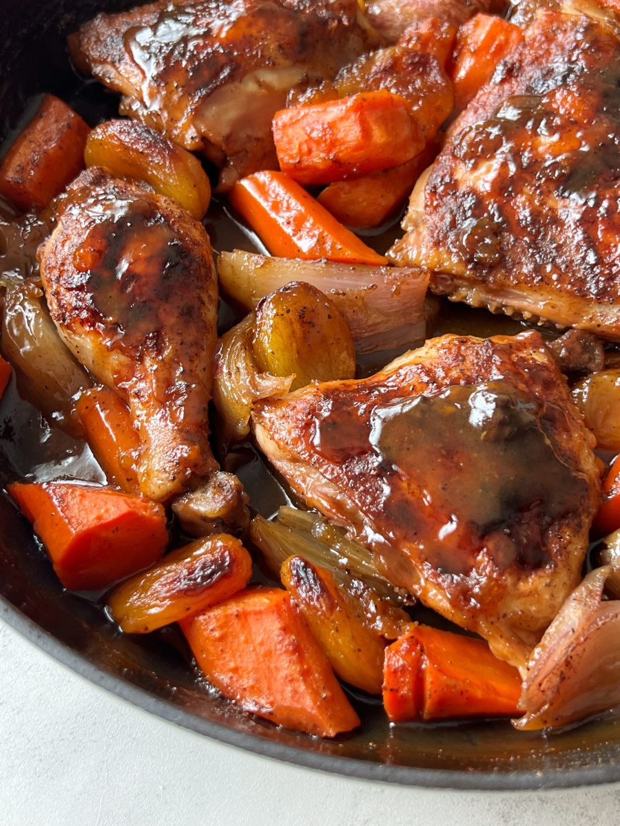 The chicken and veggies are cooked in a sweet and tangy apricot marinade made from apricot preserves, honey, balsamic vinegar and dijon mustard. It’s a simple dish to make with so much depth of flavor!